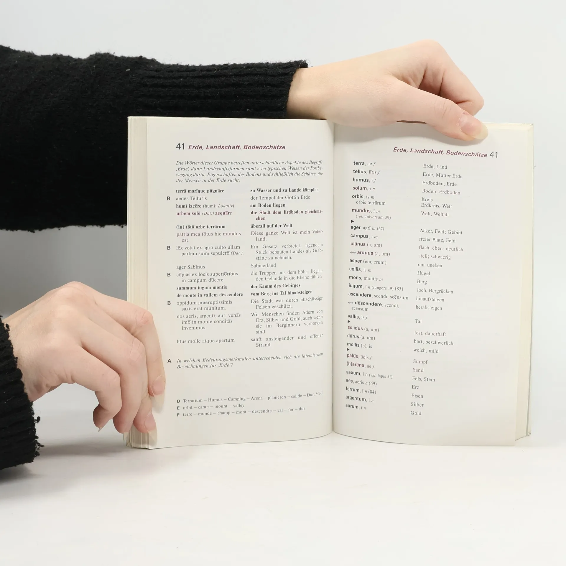 Geboten wird mit ca. 1350 Vokabeln der Grundwortschatz, weitere ca. 500 Vokabeln, im Druck abgehoben, stocken den Grundwortschatz für die Bedürfnisse der Lektürephase und des Abiturs auf. Diesem Bestand an Lernvokabeln ist Übungsmaterial - viele Wendungen; neusprachliche Verwandte; Grammatiktipps - beigegeben. Die Wörter sind in Sach- bzw. Themengruppen zusammengestellt (eingeschlossen die kleinen Wörter). Die Wörter sindnach semantischen Strukturen (wie z. B. Gegensatz oder Abstufung) angeordnet. Die Wörter werden in Minimalkontexten (Sätzen, Wendungen) präsentiert. Der Grundwortschatz bietet so vielfache Möglichkeiten, das leidige Vokabel-„Pauken“ durch entdeckendes, anschauliches, verstehendes Lernen zu unterstützen.