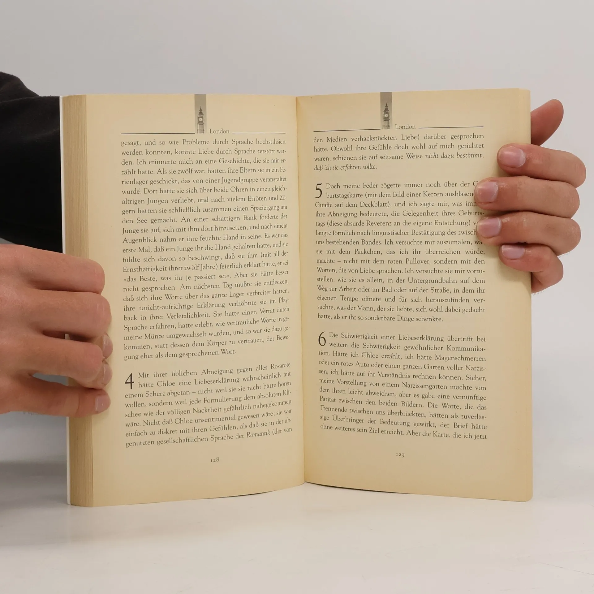 Der Held und Ich-Erzähler dieses ach so bekannten und immer wieder neuen Abenteuers der Liebe ist Mitte Zwanzig und verliebt sich auf den ersten Blick unsterblich in Chloe, eine junge und attraktive Graphikdesignerin, die auf dem Flug von Paris nach London neben ihm saß. Was so zufällig, so normal und gewöhnlich und doch vom Schicksal vorherbestimmt in der Luft beginnt, ist der Anfang einer Liebesgeschichte mit allen Aufregungen und Verwirrungen, die zwei Menschen, die einander entdecken, erleben können. Der Leser beobachtet amüsiert, wie die analytische Rationalität des Erzählers dem romantischen Überschwang der Ereignisse von Anfang entgegenläuft. Der Roman ist eine ausgelassene, selbstironische Übung in Sachen Sprache und Liebe - geistreich, heiter und leider endet sie so wie die allermeisten Liebesgeschichten.