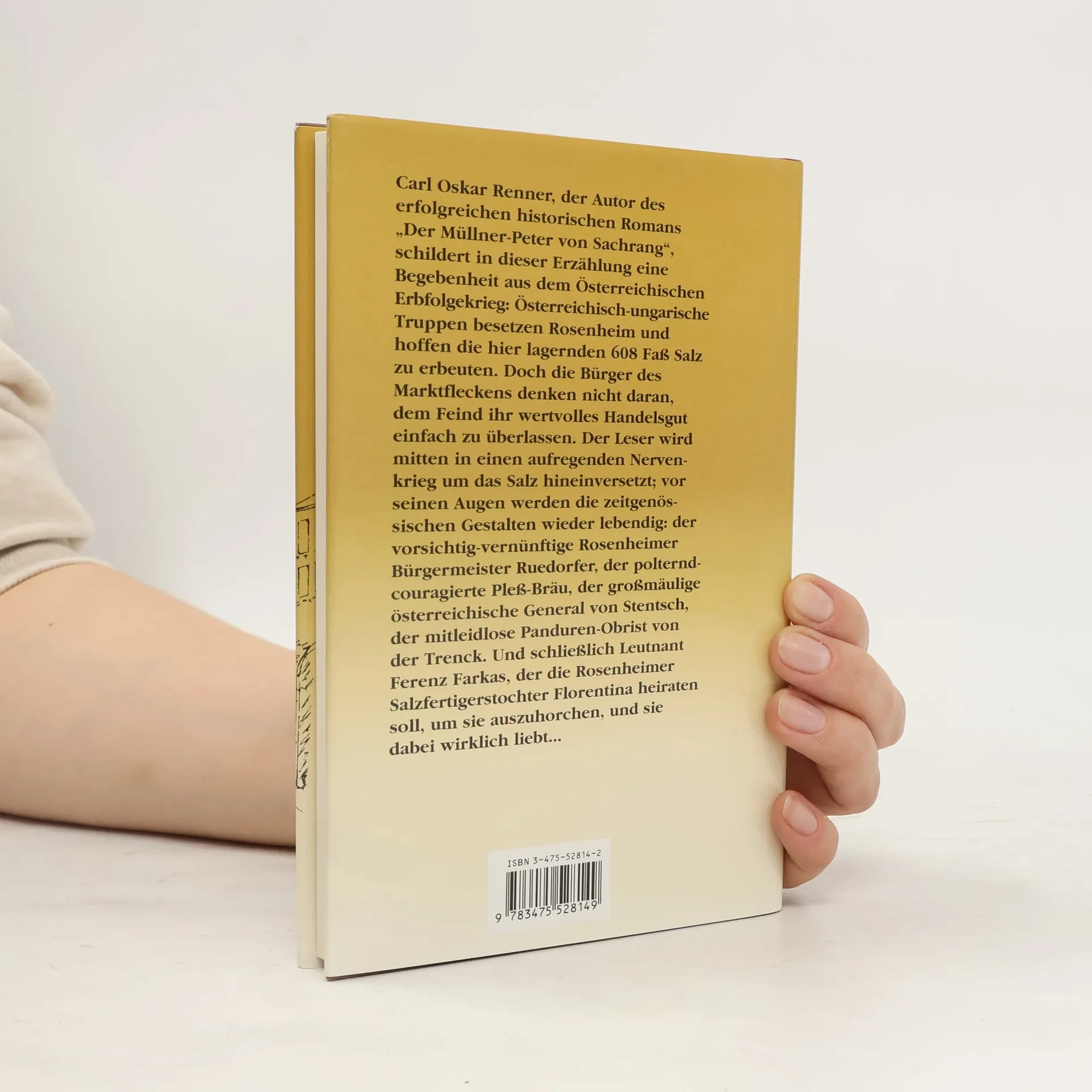 Carl Oskar Renner, der Autor des erfolgreichen historischen Romans „Der Müllner-Peter von Sachrang“, schildert in dieser Erzählung eine Begebenheit aus dem Österreichischen Erbfolgekrieg: Österreichisch-ungarische Truppen besetzen Rosenheim und hoffen die hier lagernden 608 Fass Salz zu erbeuten. Doch die Bürger des Marktfleckens denken nicht daran, dem Feind ihr wertvolles Handelsgut einfach zu überlassen. Der Leser wird mitten in einen aufregenden Nervenkrieg um das Salz hineinversetzt.
