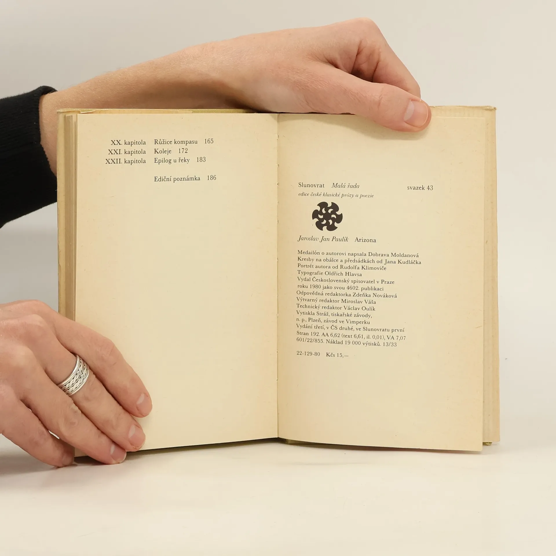 Prvotina autora Jar. J. Paulíka Arizona je prvním trampským románem, autentickým záznamem volného trampského života.Trampský motiv je v této souvislosti dobově příznačným výrazem určitého životního stylu, protestujícího proti konvencím a šosákům, nabízí jednu z možností prožít kusdobrodružství v rámci obyčejného života. Toto vydání vychází z vydání r. 1928 v Aventinu, které je jedinou edicí tohoto díla za autorova života. Medailón o autorovi napsala Dobrava Moldanová. Kresby na obálce a předsádkách od Jana Kudláčka. Portrét autora od Rudolfa Klimoviče. Vydání třetí, v ČS druhé, ve Slunovratu první. 22-129-80