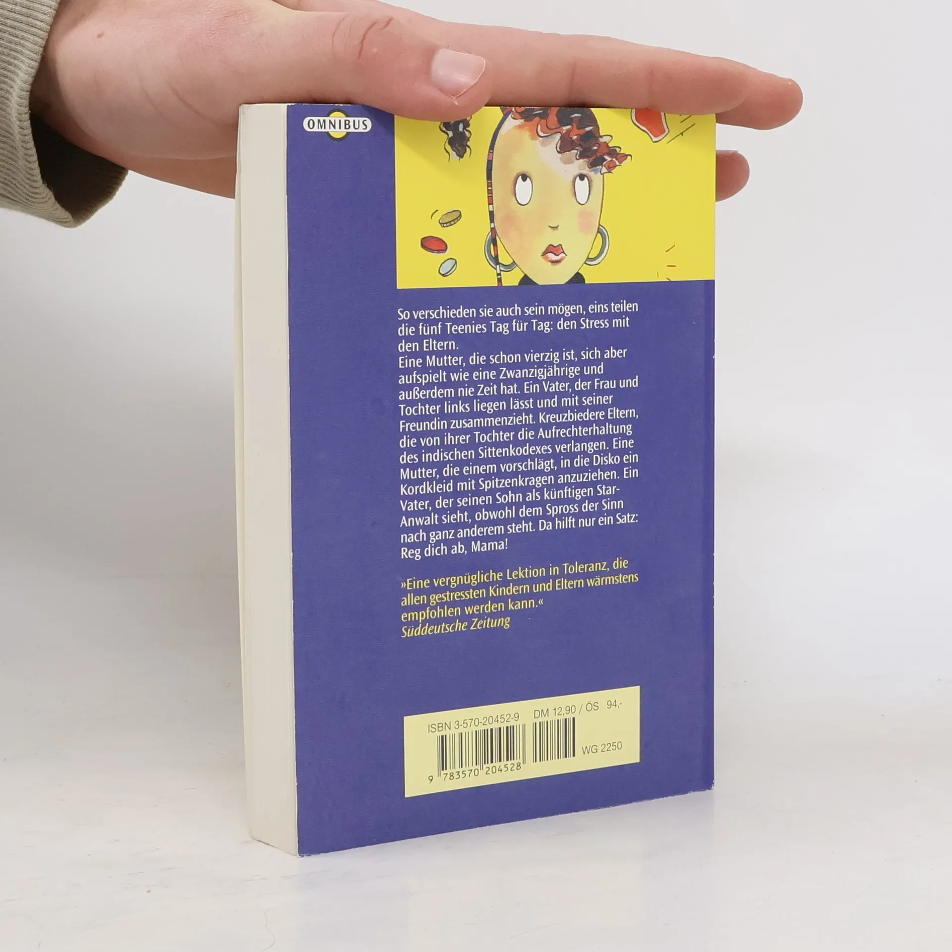 Immer Ärger mit den Eltern. Die schlimmsten Eltern, die man sich als Teenager nur vorstellen kann, machen ihren Kindern das Leben zur Hölle. Sumitha zum Beispiel weiß nicht mehr weiter: Sie hat ihren Traumboy kennen gelernt, doch ihr Vater unternimmt alles, um die aufflammende Liebe zu ersticken. Inzwischen kommt Chelseas Mutter aus ihrer Midlife-Crisis nicht heraus und Jemmas Eltern wollen aufs Land ziehen, was Jemma mit aller Macht zu verhindern versucht. Jon schließlich wird von seinem Vater gedemütigt: Es stimmt ja, dass Jon bei Mädchen einfach alles falsch macht. Auch mit Laura klappt es nicht. Das spürt Jon, obwohl Laura nicht den Mut hat, ihm zu sagen, dass sie einen anderen liebt. Aber darf ein Vater sich in aller Öffentlichkeit darüber lustig machen? Eine vergnügliche Lektion in Sachen Toleranz, die allen gestressten Kindern und Eltern wärmstens empfohlen werden kann. (zu „Reg dich ab, Mama!“) Süddeutsche Zeitung