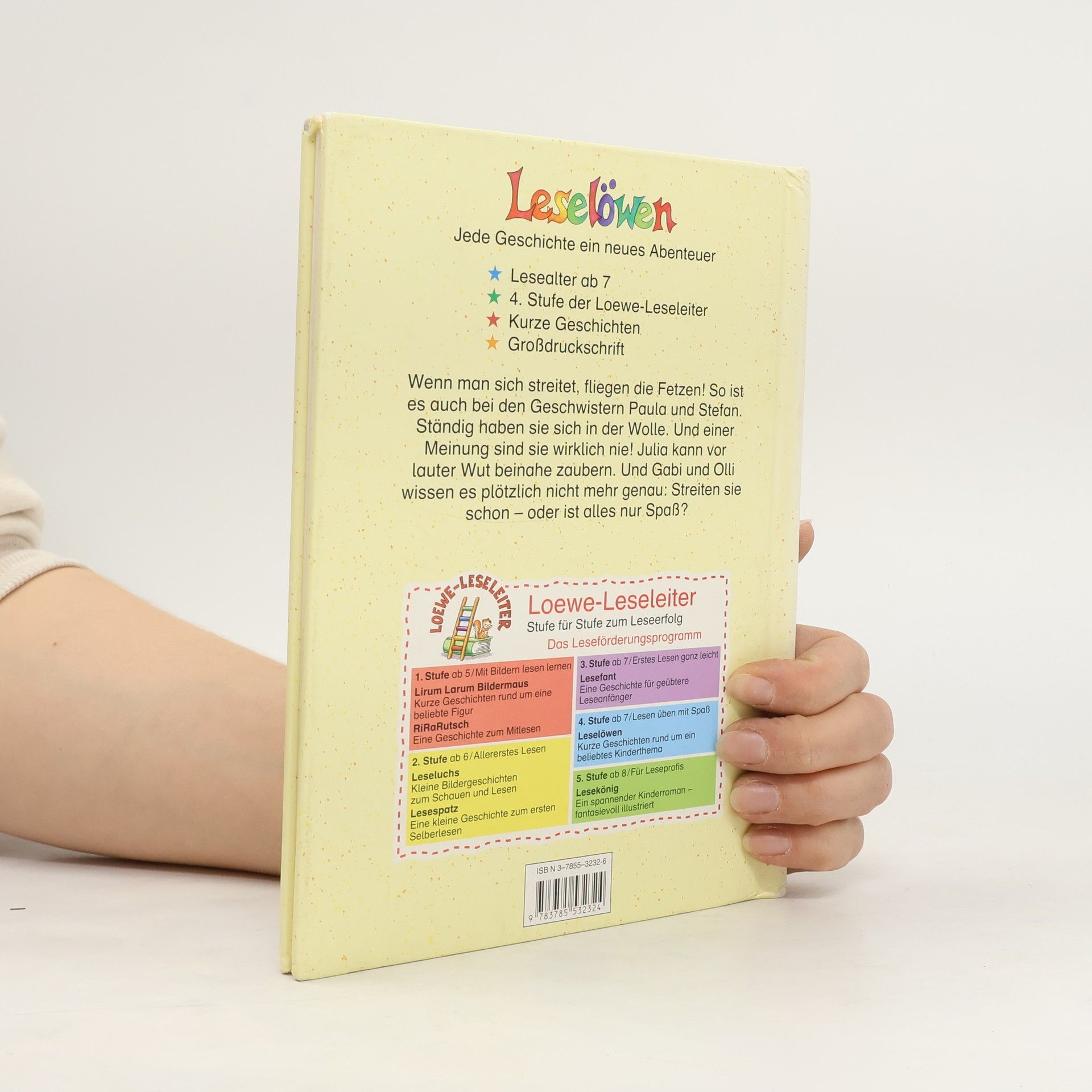 Lesealter ab 8 4. Stufe der Loewe-Leseleiter Kurze Geschichten GroßdruckschriftWenn man sich streitet, fliegen die Fetzen! So ist es auch bei den Geschwistern Paula und Stefan. Ständig haben sie sich in der Wolle. Und einer Meinung sind sie wirklich nie! Julia kann vor lauter Wut beinahe zaubern. Und Gabi und Olli wissen es plötzlich nicht mehr genau: Streiten sie schon - oder ist alles nur Spaß?