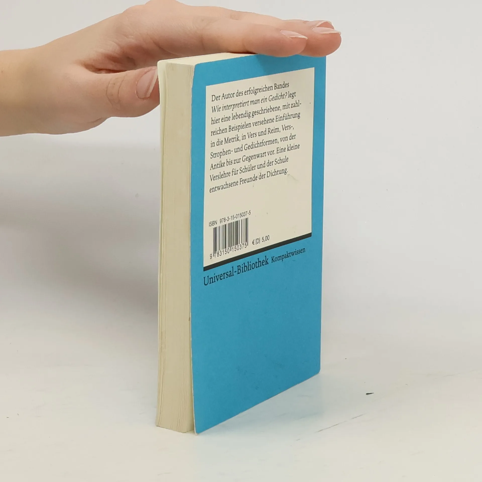 Der Autor des erfolgreichen Bandes „Wie interpretiert man ein Gedicht?“ legt hier eine lebendig geschriebene, mit zahlreichen Beispielen versehene Einführung in die Metrik, in Vers und Reim, Vers-, Strophen- und Gedichtformen, von der Antike bis zur Gegenwart vor. Eine kleine Verslehre für Schüler und der Schule entwachsene Freunde der Dichtung.