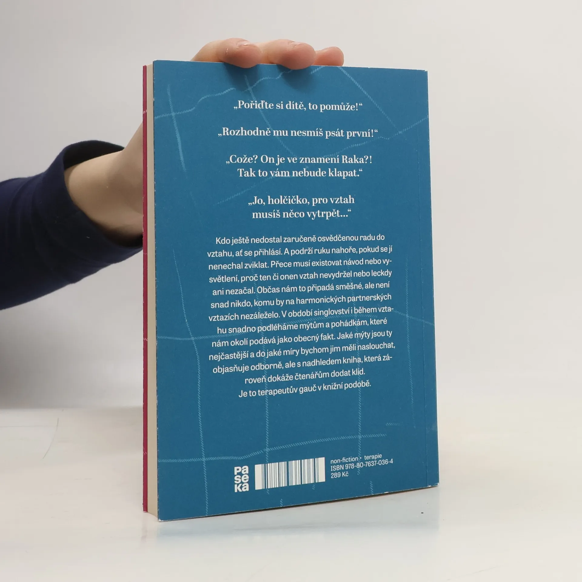 "Pořiďte si dítě, to pomůže!" "Rozhodně mu nesmíš psát první!" "Cože? On je ve znamení Raka?! Tak to vám nebude klapat. "Jo, holčičko, pro vztah musíš něco vytrpět..." Kdo ještě nedostal zaručeně osvědčenou radu do vztahu, ať se přihlásí. A podrží ruku nahoře, pokud se jí nenechal zviklat. Přece musí existovat návod nebo vysvětlení, proč ten či onen vztah nevydržel nebo leckdy ani nezačal. Občas nám to připadá směšné, ale není snad nikdo, komu by na harmonických partnerských vztazích nezáleželo. V období singlovství i během vztahu snadno podléháme mýtům a pohádkám, které nám okolí podává jako obecný fakt. Jaké mýty jsou ty nejčastější a do jaké míry bychom jim měli naslouchat, objasňuje odborně, ale s nadhledem kniha, která zároveň dokáže čtenářům dodat klid. Je to terapeutův gauč v knižní podobě.
