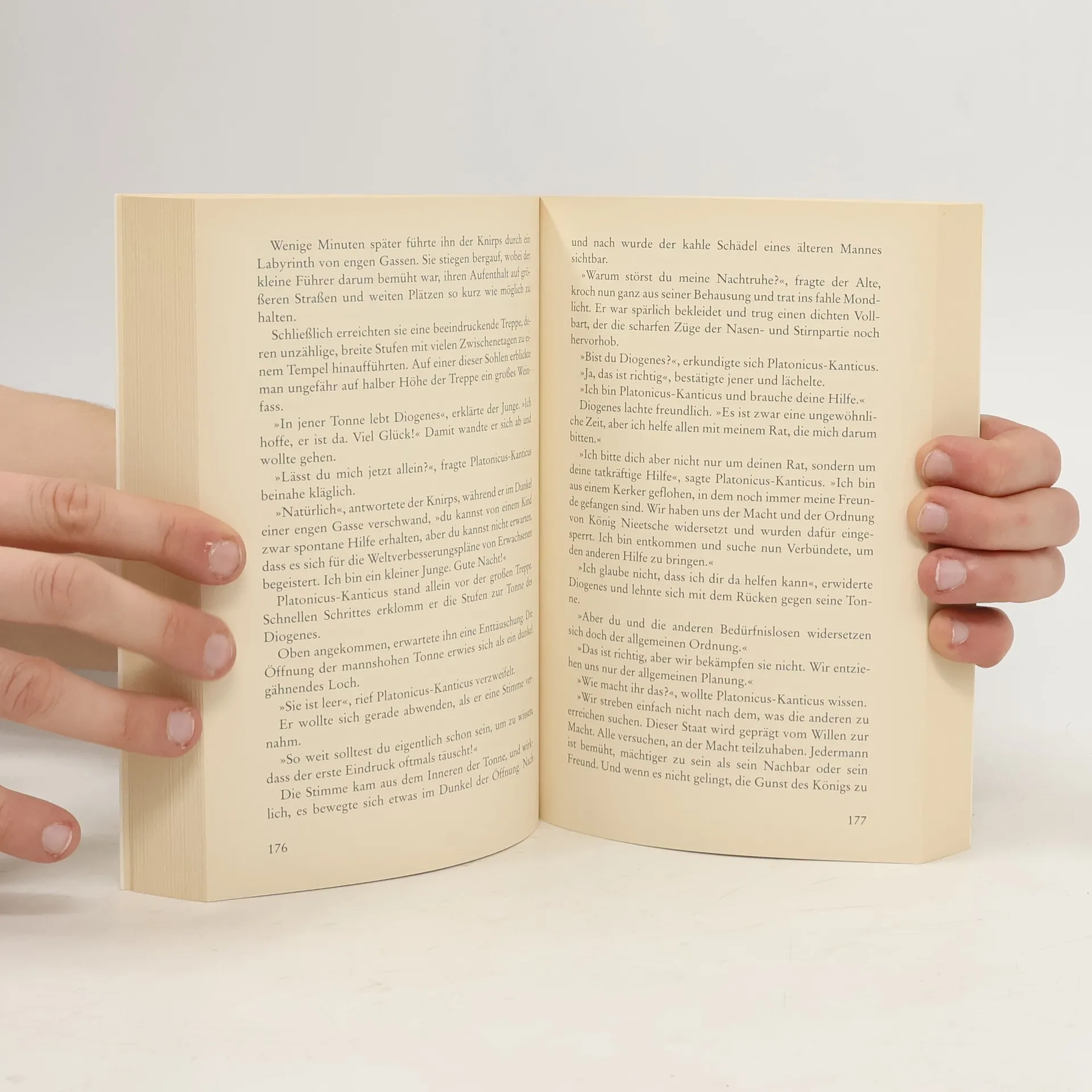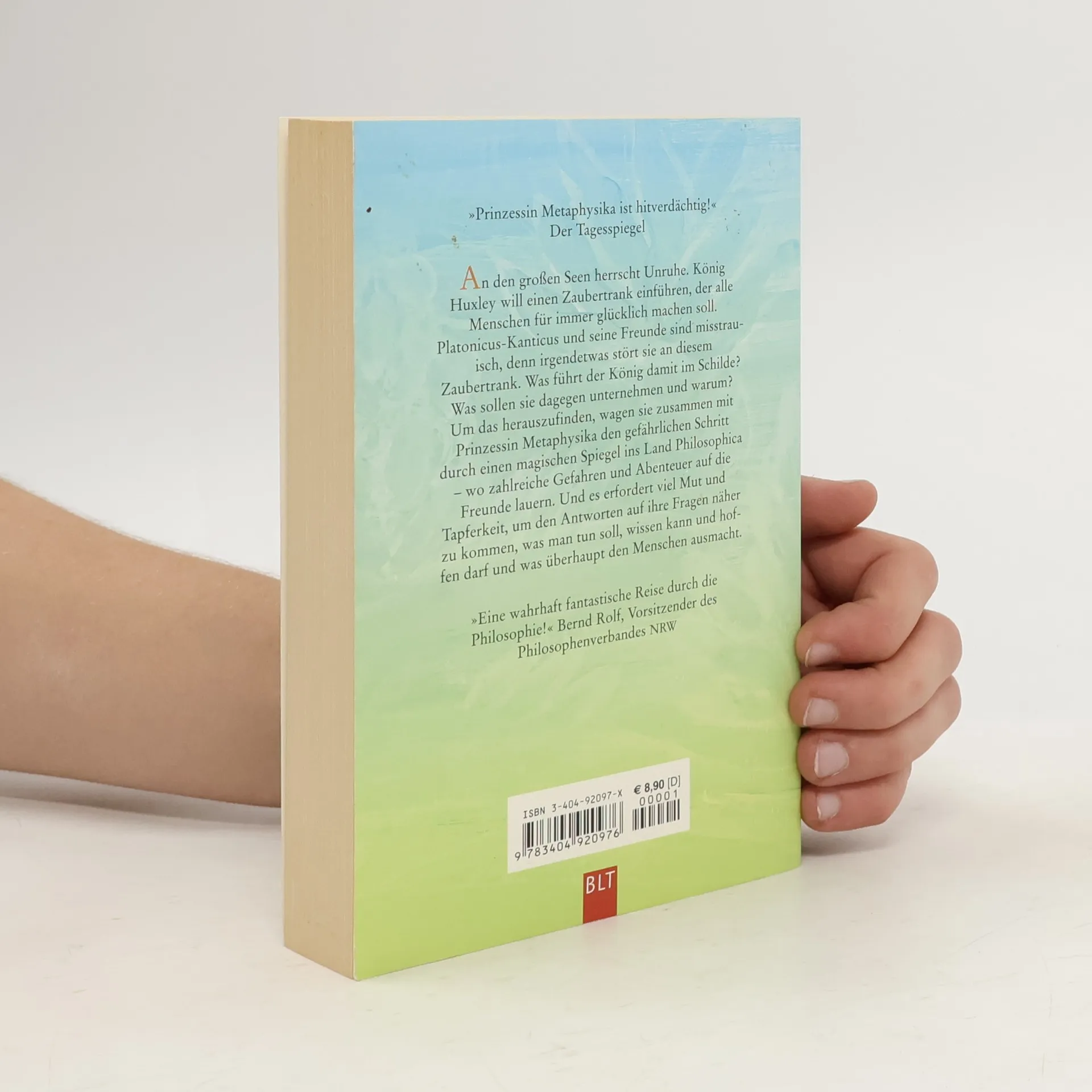Hier wird in Form eines spannenden Abenteuermärchens Jugendlichen und interessierten Erwachsenen Philosophiegeschichte nahegebracht. An den großen Seen herrscht Unruhe: König Huxley will einen Zaubertrank einführen, der alle Menschen für immer glücklich machen soll. Platonicus-Kanticus und seine Freunde sind mißtrauisch. Was führt der König damit im Schilde? Was stört sie an diesem Zaubertrank? Was sollen sie dagegen unternehmen und warum? Um das herauszufinden, wagen sie zusammen mit der Prinzessin Metaphysika den Schritt durch den magischen Spiegel ins Land Philosophica. Dort lauern zahlreiche Gefahren und Abenteuer, die die Freunde gemeinsam bestehen. So kommen sie mit viel Mut und Tapferkeit der Antwort auf die Frage näher, was man tun soll, wissen kann und hoffen darf, und was überhaupt den Menschen ausmacht. Philosophische Themen erfahren in diesem Märchen eine poetische Verklärung, indem sie auf der Ebene jugendlicher Wißbegierde erzählt werden. Phantasie, Nachdenken und auch kritischer Geist erfahren so eine nachdrückliche Anregung. Auch der mit der Materie vertraute Leser wird mit Vergnügen die Abenteuer mit Künig Nieetsche, Athuro Weltschmerz, Rene dem Zweifler und manchen anderen Bewohnern des Landes Philosophica verfolgen.