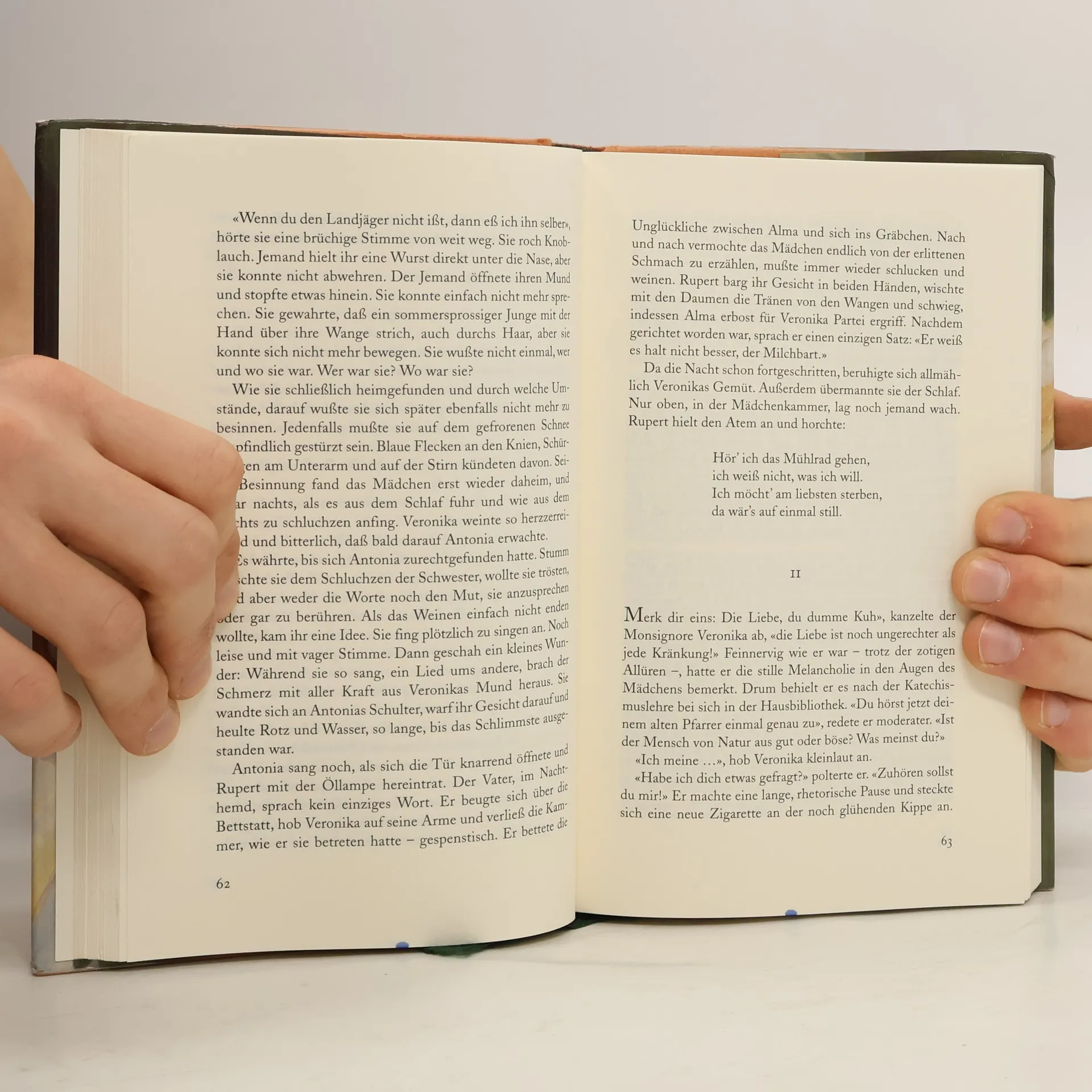 Im Jahre 1922 im kleinen Vorarlberger Dorf St. Damian. Die 7-jährige Antonia wächst in heiler Welt mit ihren drei Schwestern auf. Der Vater vergöttert seine fünf Frauen, fördert besonders Antonias deutliche Musikalität und ihren \"betörenden\" Sopran. Er lebt weit über seine Verhältnisse, einige Jahre später macht er bankrott, verschwindet spurlos, der Hof wird versteigert, Antonia an einen Menschenhändler verkauft, der sie mit nach Amerika nimmt. Unterwegs lernt Antonia Balthasar kennen, autistisch, missbraucht, offenbar stumm, die beiden leben im sozialen Abseits, Rauschgift, Prostitution, die Ausweglosigkeit scheint vorprogrammiert. Aber es ist die Musik, die den märchenhaft anmutenden zweiten Teil des Buches beherrscht und die Wende bringt.