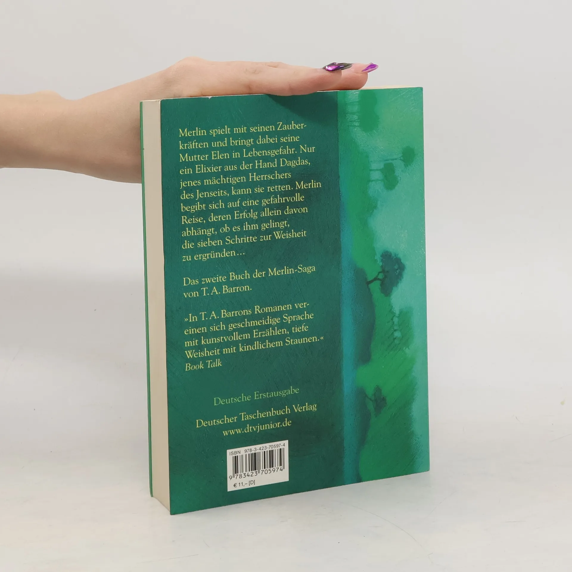 Auf Fincayra, der fantastischen Insel irgendwo zwischen den Welten, fühlt Merlin seine magischen Kräfte wachsen. Das macht ihn stolz, aber auch hochmütig – und einsam. Schließlich wagt er den Zauber, seine Mutter zu sich auf die Insel zu holen. Doch kaum angekommen, wird sie von Merlins ärgstem Feind vergiftet. Retten kann sie jetzt nur noch Dagdas lebensspendendes Elexier. Merlin weiß, dass er Dagdas Heimat nur betreten darf, wenn er zuvor die sieben Schritte zur Weisheit ergründet hat. Vor ihm liegt eine weite und gefährliche Reise durch das ganze Land - und die Zeit drängt. Dennoch will er wagen, was einst seinem Großvater, Fincayras größtem Weisen, das Leben gekostet hatte... Das 2. Buch der Merlin-Saga von T. A. Barron Deutsche Erstausgabe Die Merlin-Welt des Autors T. A. Barron könnt ihr übrigens auch auf dessen homepage www. tabarron. com kennen lernen.