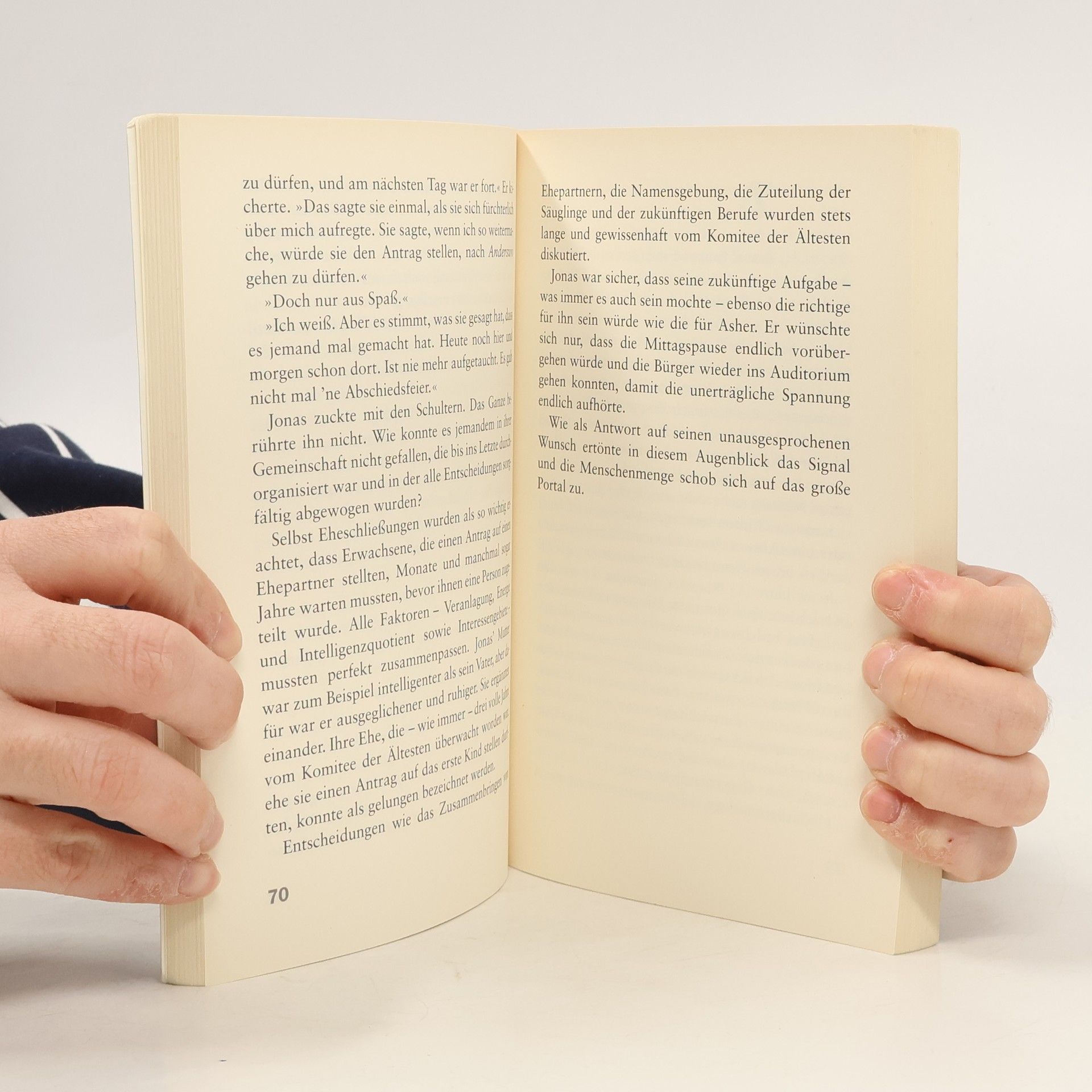 »Stark und provokativ!« New York Times Jonas lebt in einer Welt ohne Not, Schmerz und Risiko. Alles ist perfekt organisiert, niemand muss sich über irgendetwas Sorgen machen, sogar die Berufe werden zugeteilt. Als Jonas Nachfolger des »Hüters der Erinnerung« werden soll, beginnt er eine Ausbildung beim alten Hüter. Und hier erfährt er, welch hohen Preis sie alle für dieses scheinbar problemlose Leben zu zahlen haben. Jonas' Bild von der Gesellschaft, in der er lebt, bekommt immer mehr Risse, bis ihm klar wird, dass er seinen kleinen Pflegebruder Gabriel diesem unmenschlichen System keinesfalls ausliefern möchte. Es bleibt ihm nur die Flucht - ein lebensgefährliches Unterfangen ...