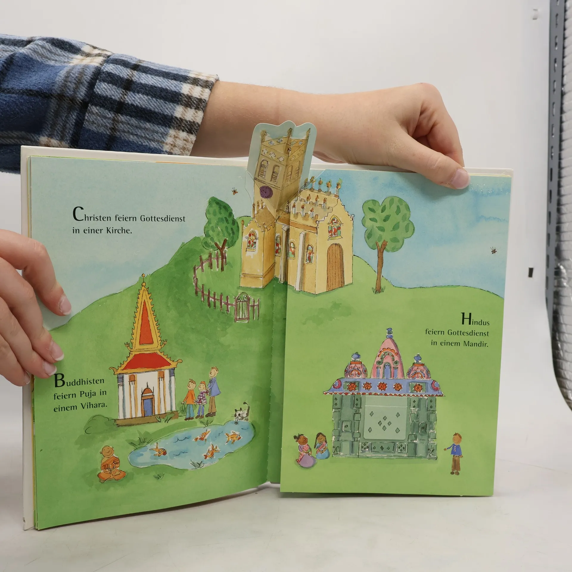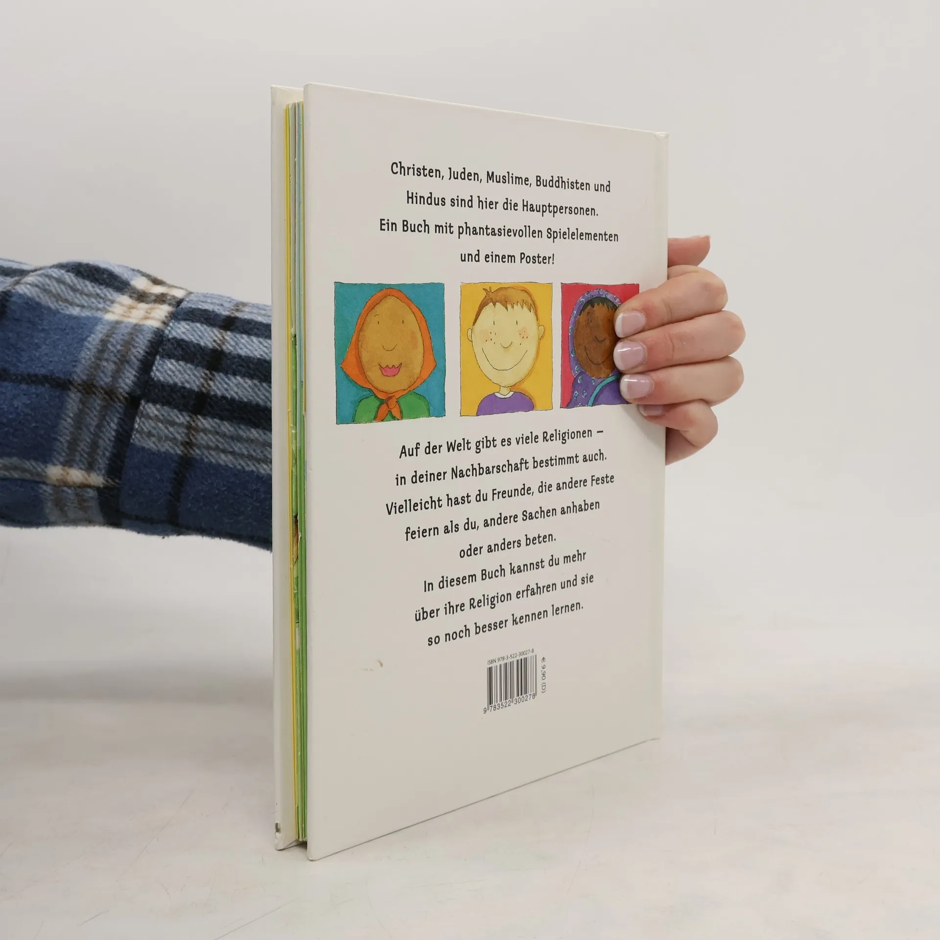 Die Weltreligionen spielerisch kennen lernen Ein allererstes Sachbilderbuch zu den fünf großen Weltreligionen Buddhismus, Hinduismus, Islam, Judentum und Christentum Christen, Juden, Muslime, Buddhisten und Hindus sind in diesem Sachbilderbuch die Hauptpersonen. Hier kann man Seiten ausklappen, durch Gucklöcher schauen und Fenster öffnen. Man erfährt etwas über die Unterschiede und Gemeinsamkeiten in der Kleidung und bei den Kopfbedeckungen. Wie die Kirchen und Tempel der Religionen aussehen, weiß man hinterher ebenfalls. Man sieht die Geräte, die im Gottesdienst verwendet werden, und die heiligen Schriften der Religionen. Und wie ist das zu Hause: Wer betet wann und wie? Gefeiert wird natürlich auch. Das Poster mit den wichtigsten Festen der Religionen kann man sogar herausnehmen. Autorenporträt: Emma Damon arbeitete nach ihrem Kunststudium in Manchester für renommierte Verlage und zeichnet auch für den englischen Fernsehsender BBC. Zur Zeit lebt sie in Großbritannien, fühlt sich aber auf der ganzen Welt zu Hause.