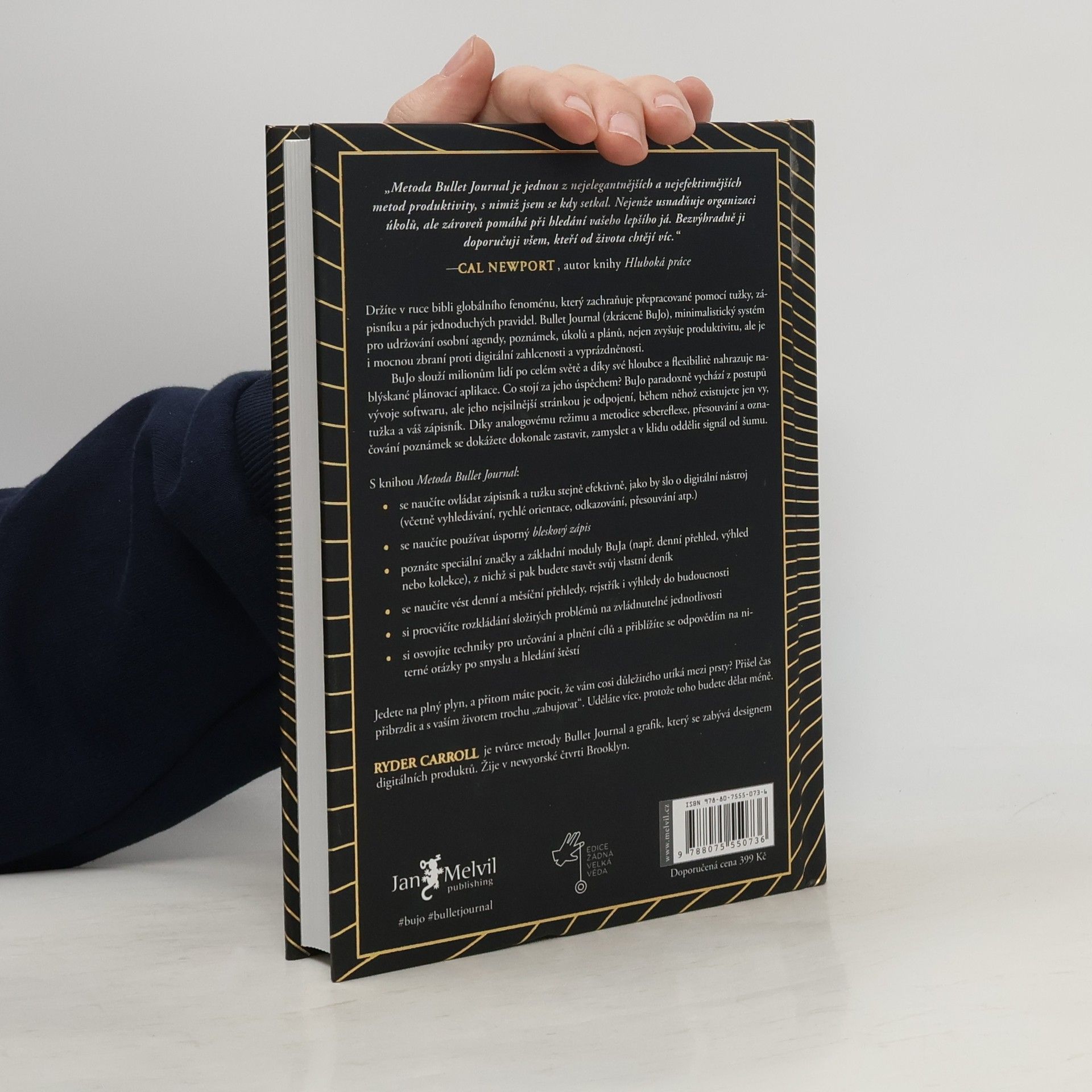 Vítejte ve světě fenoménu Bullet Journal! Tento deník je určen pro frustrované sepisovatele seznamů úkolů, přetížené multitaskery i kreativce, kteří hledají řád. Ryder Carroll vytvořil metodiku Bullet Journal jako řešení své poruchy pozornosti, avšak kouzlo ručního zápisu a systému organizace uchvátilo miliony uživatelů. Kromě přehledného postupu, jak se vypořádat s přívalem úkolů, nabízí i hlubší roviny: zklidnění mysli a schopnost sebereflexe. Naučíte se identifikovat to, co je důležité, oddělovat signál od šumu a žít s vědomím cílů. Bullet Journal vychází z metodik používaných při vývoji softwaru, ale stačí vám zápisník a tužka. Může se stát plánovačem, deníkem, kalendářem, organizátorem či skicákem. Jak se vy vyvíjíte, tak se vyvíjí i váš Bullet Journal. Díky knize se naučíte základy metodiky, typy značek a odrážek, jak psát denní a měsíční přehledy, vytvářet rejstřík a plánovat projekty. Objevíte také, jak dekonstruovat problémy, využít deník vděčnosti a najít smysl a štěstí. Metoda Bullet Journal vám pomůže efektivněji využívat čas a energii, což vám umožní udělat více práce tím, že se zaměříte na méně úkolů. Zasloužíte si to!