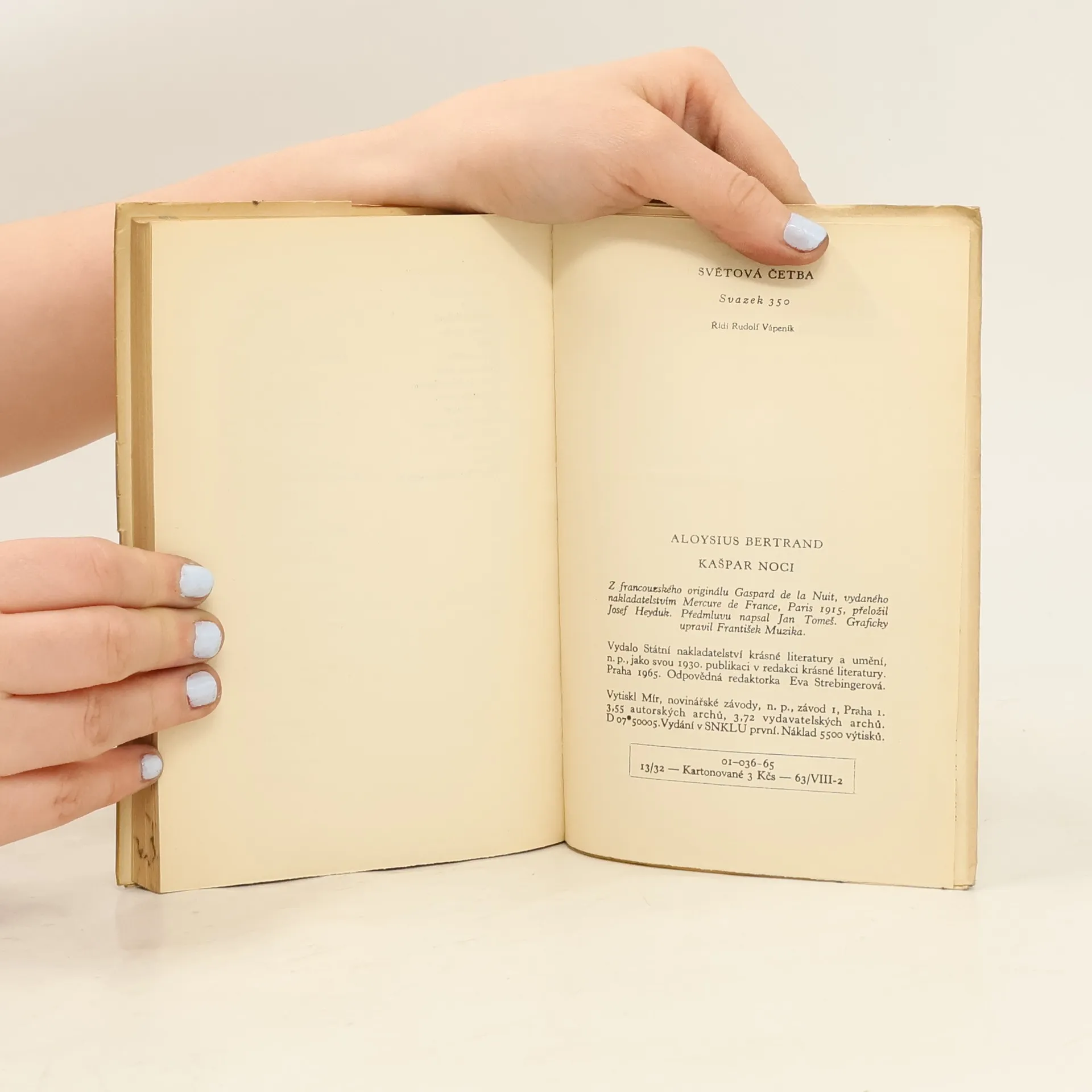 Kašpar Noci: fantasie na způsob Rembrandta a Callota Drobné, do šesti cyklů uspořádané vysoce poetické prózy francouzského romantického básníka a dramatika, uznávaného za jednoho z učitelů surrealismu. „Svou vnímavostí pro pitoreskní detail, fantastickou drobnokresbu a humorný postřeh objevil nové možnosti poetické emocionality a sugestivity, které nezůstaly bez vlivu na Baudelaira, Rimbauda ani na básníky pozdější.“