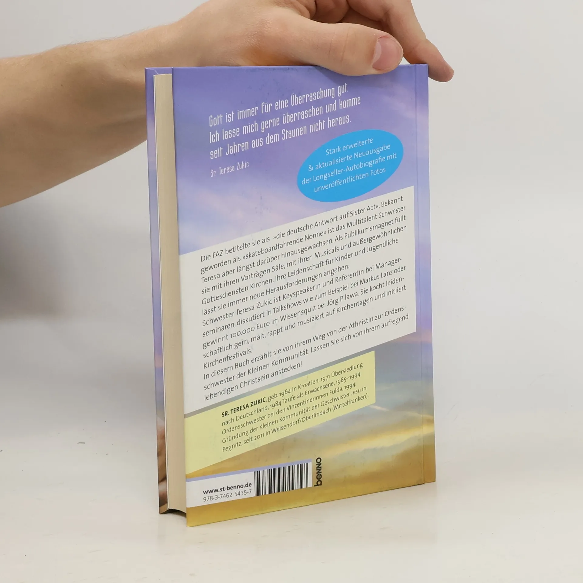 Teresa Zukics Leben steht niemals still: Seit über acht Jahren geht die umtriebige Ordensschwester, Autorin, Künstlerin und Komponistin auf Tour in über 200 Orte in Deutschland, Österreich und der Schweiz. Mit ihren Vortragsthemen begeistert sie das Publikum, ob Manager oder Gemeinden. Auch ihre 1999 erstmals erschienene Autobiografie »Das Skateboard Gottes« hat über Jahre hinweg zahllose Menschen berührt. Die aktualisierte und erweiterte Neuausgabe widmet sich dem neuen Abschnitt in Schwester Teresas Leben, der deutlich zeigt: Glaube wird nie langweilig! - stark erweiterte und aktualisierte Neuausgabe der Longseller-Autobiografie - mit unveröffentlichten Fotos aus dem Leben von Sr. Teresa