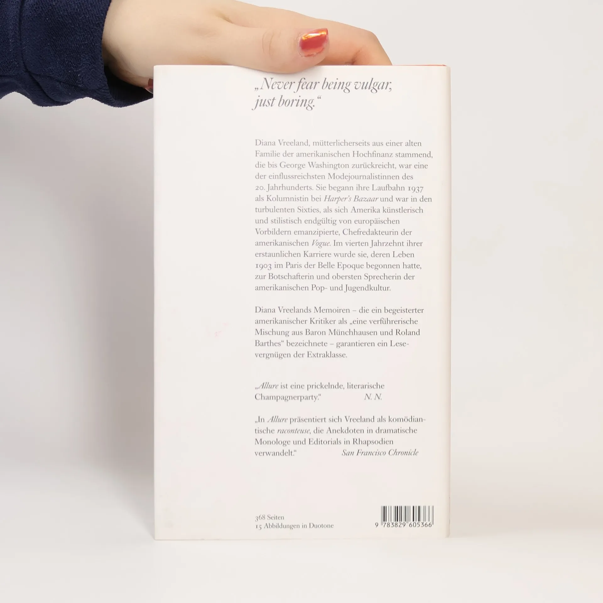 Diana Vreeland, geboren 1906 in eine alte Familie der amerikanischen Hochfinanz, war eine der einflussreichsten Modejournalistinnen des 20. Jahrhunderts. Ihre Karriere begann 1937 bei Harper’s Bazaar, wo sie von Chefredakteurin Carmel Snow entdeckt wurde. Zuvor hatte Vreeland schnell den Weg vom Partygirl zur Dame von Welt zurückgelegt und ein Dessousgeschäft in London betrieben. Von 1962 bis 1972 war sie Chefredakteurin der amerikanischen Vogue, während sich Amerika künstlerisch von europäischen Vorbildern emanzipierte. Vreeland arbeitete zwischen Warhol und dem Weißen Haus; Jacqueline Kennedy und Andy Warhol waren enge Vertraute. Ihre Kompetenz in Modefragen krönte sie als Kuratorin der Kostümabteilung des Metropolitan Museum in New York. Ihre 1984 erschienene Autobiographie, nun erstmals auf Deutsch, ist witzig, geistreich und märchenhaft. Ein amerikanischer Kritiker beschrieb sie als „eine verführerische Mischung aus Baron Münchhausen und Roland Barthes“, was die Verbindung von Gesellschaftsreportage und philosophischen Reflexionen über Luxus und Mode treffend beschreibt. Das hochkarätige Personal, das in ihrem Werk auftaucht, reicht von Diaghilew und Nijinsky bis zu Greta Garbo und Yves Saint Laurent. Das temporeiche Buch verspricht ein außergewöhnliches Lesevergnügen. Einige Kritiker empfehlen sogar, Passagen auswendig zu lernen.