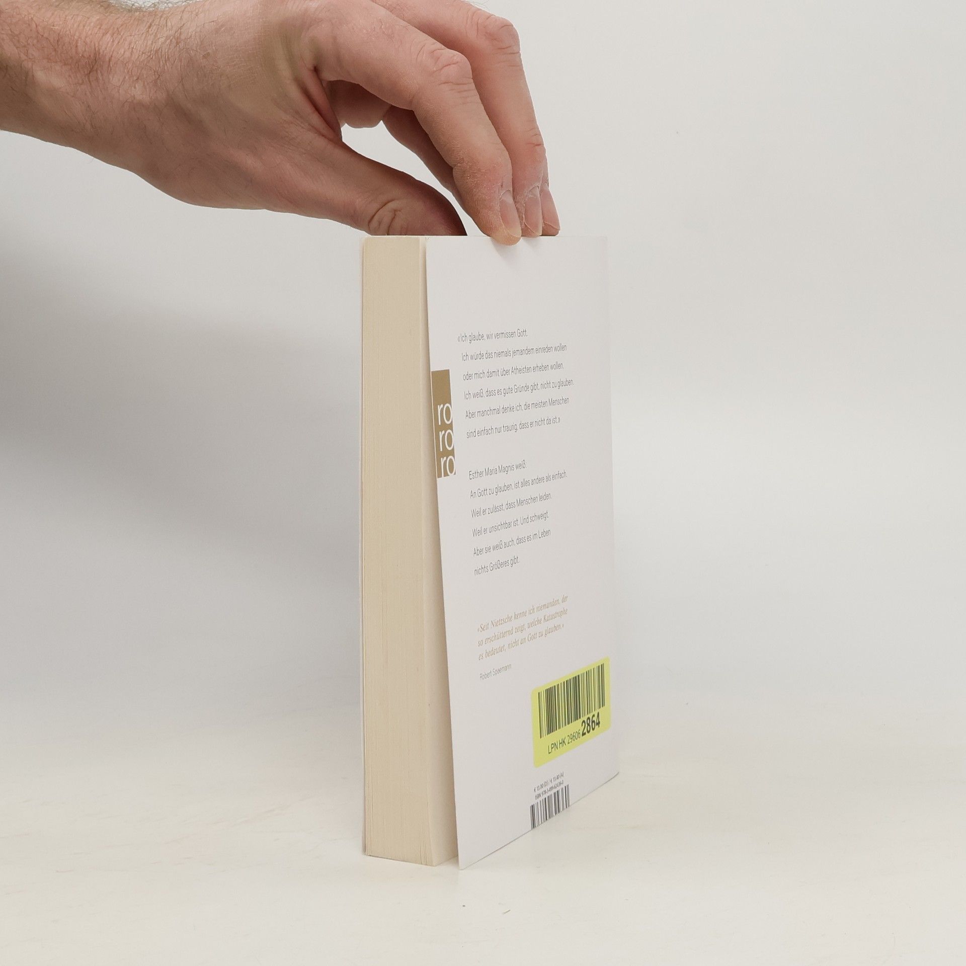 «Ich glaube, wir vermissen Gott. Ich würde das niemals jemandem einreden wollen oder mich damit über Atheisten erheben wollen. Ich weiß, dass es gute Gründe gibt, nicht zu glauben. Aber manchmal denke ich, die meisten Menschen sind einfach nur traurig, dass er nicht da ist.» Esther Maria Magnis weiß: An Gott zu glauben, ist alles andere als einfach. Weil er zulässt, dass Menschen leiden. Weil er unsichtbar ist. Und schweigt. Aber sie weiß auch, dass es im Leben nichts Größeres gibt. «Seit Nietzsche kenne ich niemanden, der so erschütternd zeigt, welche Katastrophe es bedeutet, nicht an Gott zu glauben.» (Robert Spaemann)
