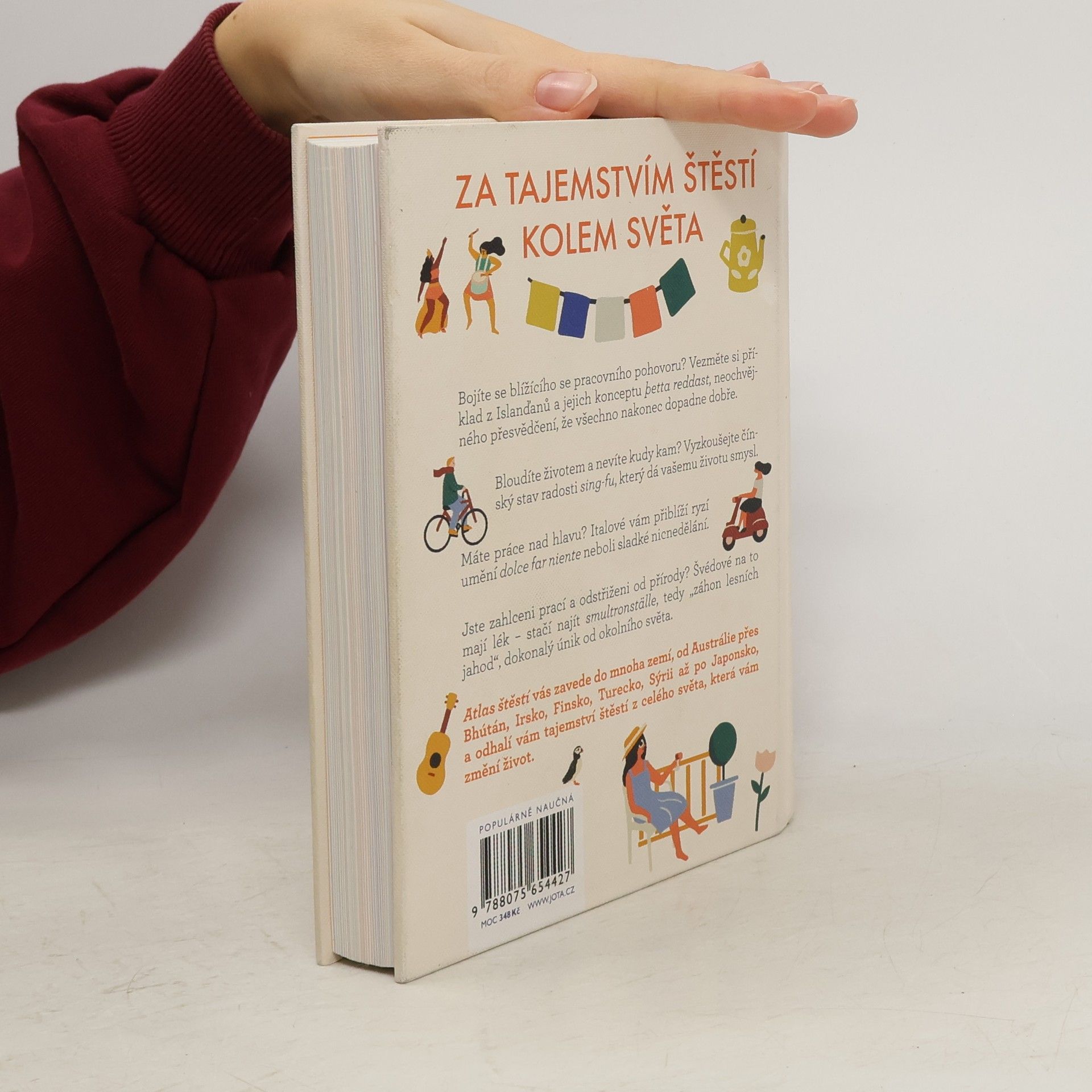 Cesta kolem světa a 33 mezinárodních návodů, jak dosáhnout štěstí. Bojíte se blížícího se pracovního pohovoru? Vezměte si příklad z Islanďanů a jejich konceptu þetta reddast, neochvějného přesvědčení, že všechno nakonec dopadne dobře.Bloudíte životem a nevíte kudy kam? Vyzkoušejte čínský stav radosti sing-fu, který dá vašemu životu smysl.Máte práce nad hlavu? Italové vám přiblíží ryzí umění dolce far niente neboli sladké nicnedělání.Jste zahlceni prací a odstřiženi od přírody? Švédové na to mají lék – stačí najít smultronställe, tedy „záhon lesních jahod“, dokonalý únik od okolního světa.Atlas štěstí vás zavede do mnoha zemí, od Anglie přes Bhútán, Irsko, Finsko, Turecko, Sýrii až po Japonsko a odhalí vám taje štěstí z celého světa, které vám změní život.