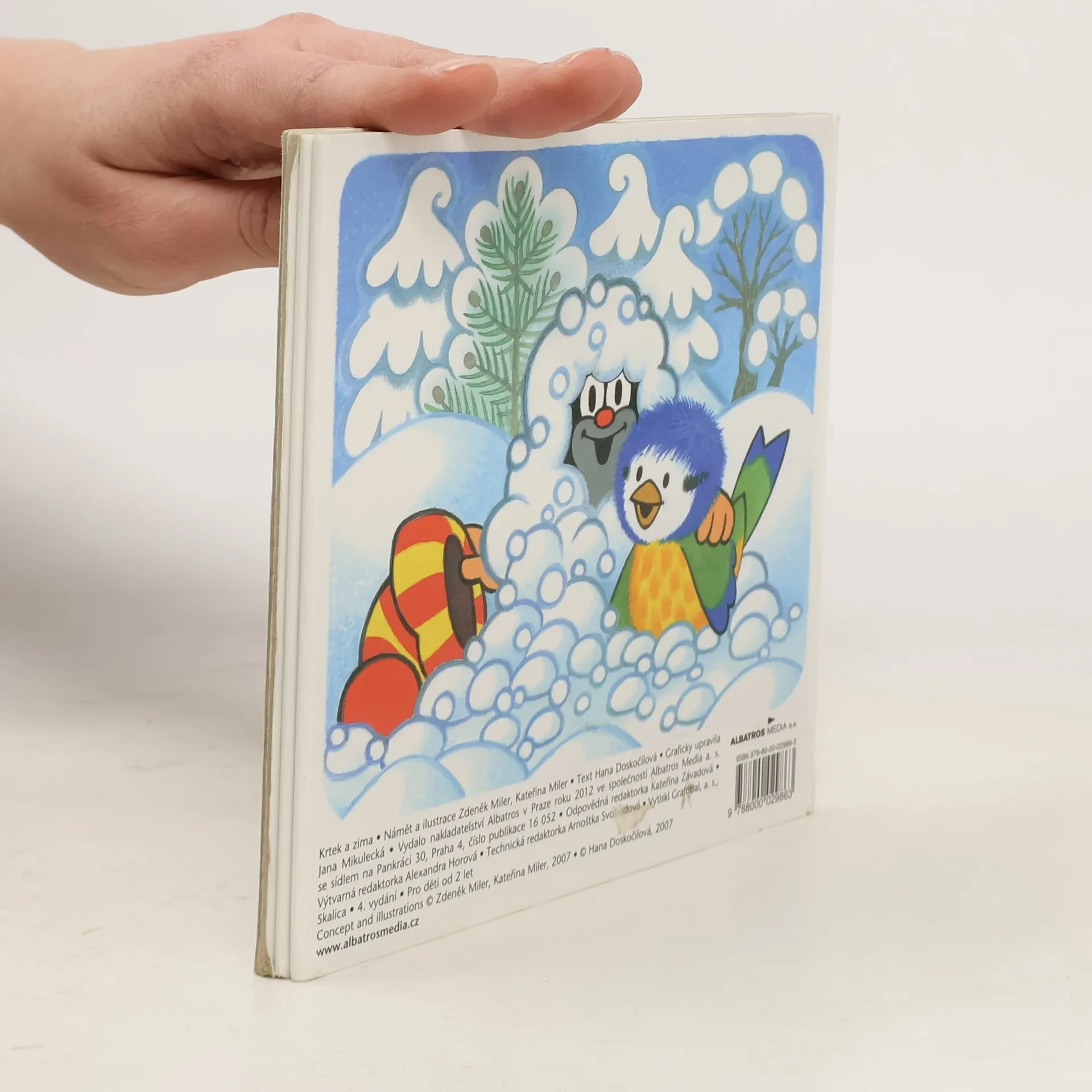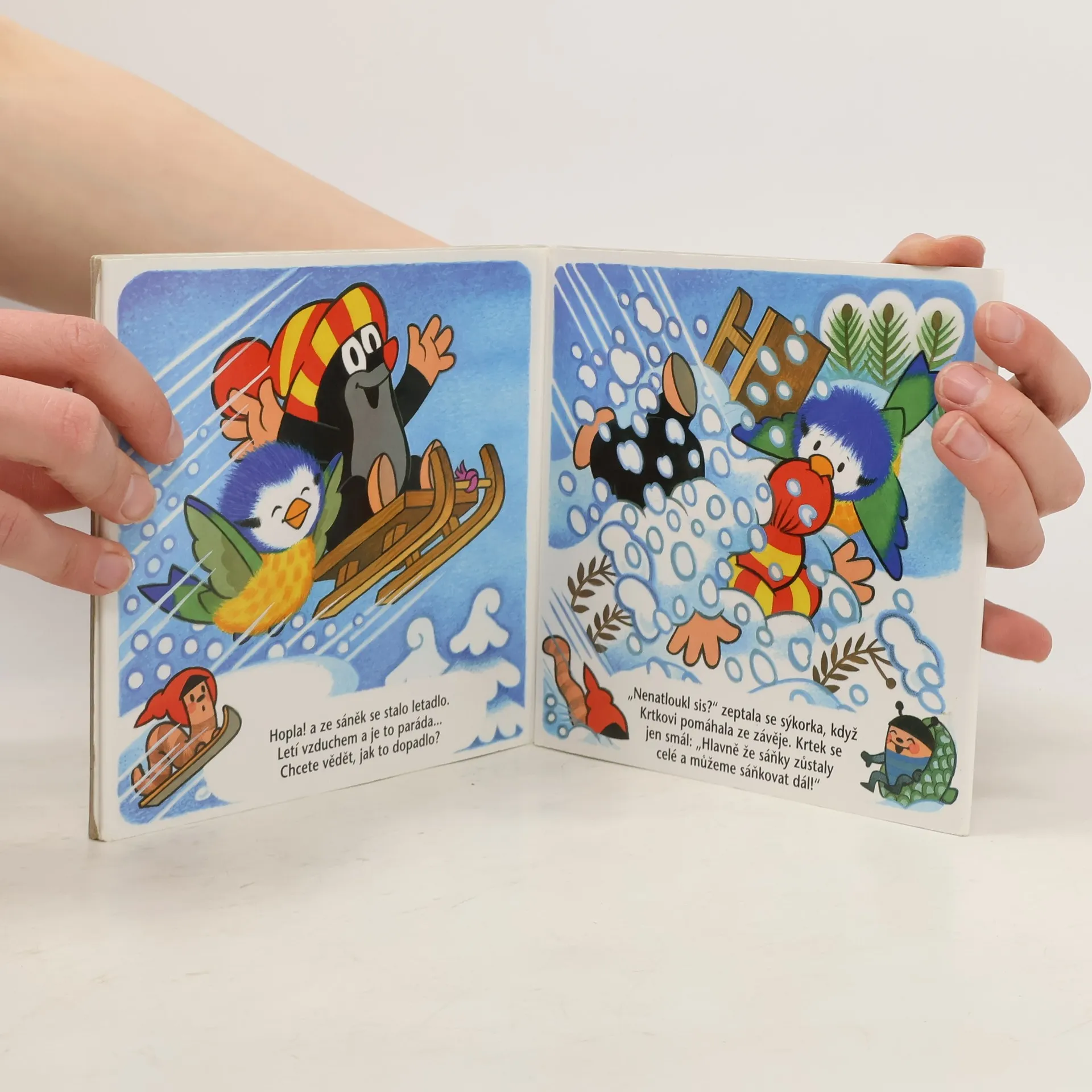 3. vydání Konečně je tu zima! řekl si Krtek a vytáhl sáňky. Ale co to? Bílo je všude, ale sníh to není, jen jinovatka. Copak se dá na jinovatce sáňkovat? Na obloze je jen jediný mráček, mráček chudinka, z toho chumelit nebude, postěžoval si Krtek. Ale když se Krtek se sýkorkou postarali, aby se mráček napil vody, mráček rostl, mohutněl, až se z něj začaly sypat vločky, jedna pěknější než druhá. A sníh se sypal a sypal, až jim sáňky v závěji téměř zapadly. Teď jim teprve začala sáňkovačka a koulovačka a ty pravé zimní radovánky!