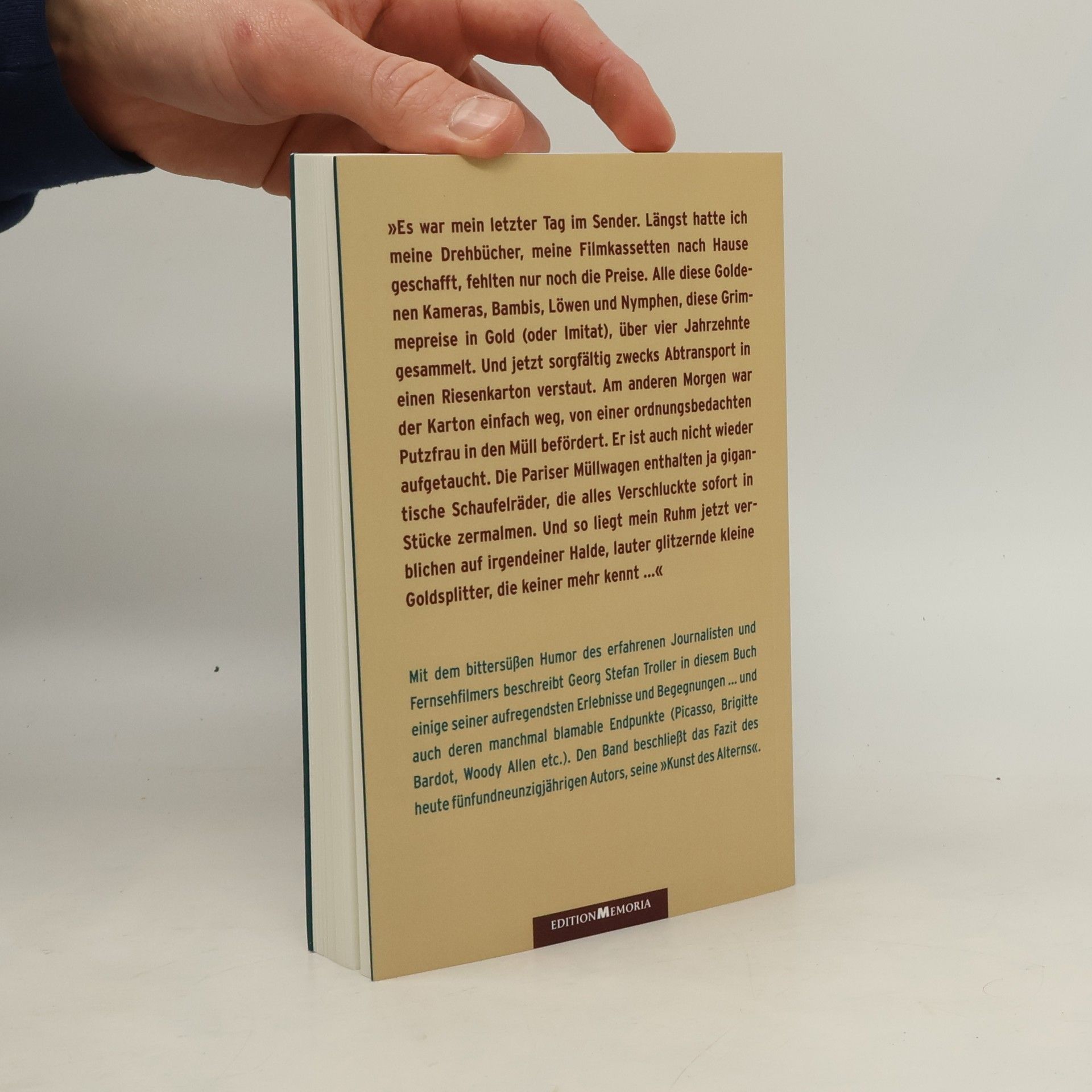 Mit dem bittersüßen Humor des erfahrenen Journalisten und Fernsehfilmers beschreibt Georg Stefan Troller, einer der letzten Zeugen und Betroffenen des Exils 1933-1945, in diesem Buch einige seiner aufregendsten Erlebnisse und Begegnungen und auch deren manchmal blamables Ende (Picasso, Brigitte Bardot, Woody Allen etc.). Ferner enthält der Band von Altersweis- heit geprägte Aufsätze „Über Freundschaft und Liebe“ oder „Die Kunst des Alterns“.