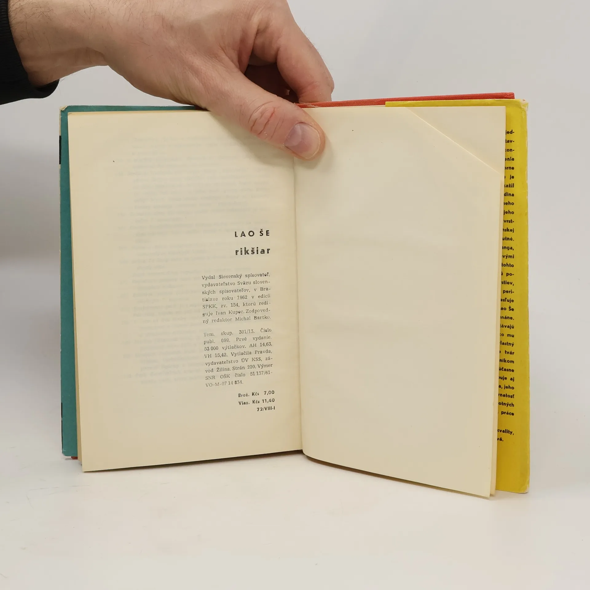 Rikšiar (1936) je klasické dielo modernej čínskej literatúry. Lao Še v ňom s láskou a súcitom opisuje neľahký život mladého a čestného dedinčana Sianga, ktorý ujde do Pekingu, aby sa tu stal rikšiarom. Napriek jeho dobrej vôli a usilovnej práci ho postupne ničí spoločnosť, v ktorej panujú len peniaze. Zamiluje sa do mladej krásnej dievčiny, ktorá z biedy začne pracovať ako prostitútka a stihne ju tragický osud. Sianga stretávajú nové a nové ťažkosti a ako mu postupne ubúda síl v zápase o holý život, stále jasnejšie vystupuje jeho myšlienkový a citový život húževnatého a silného človeka, ktorý dokáže žiť aj v tých najťažších podmienkach.