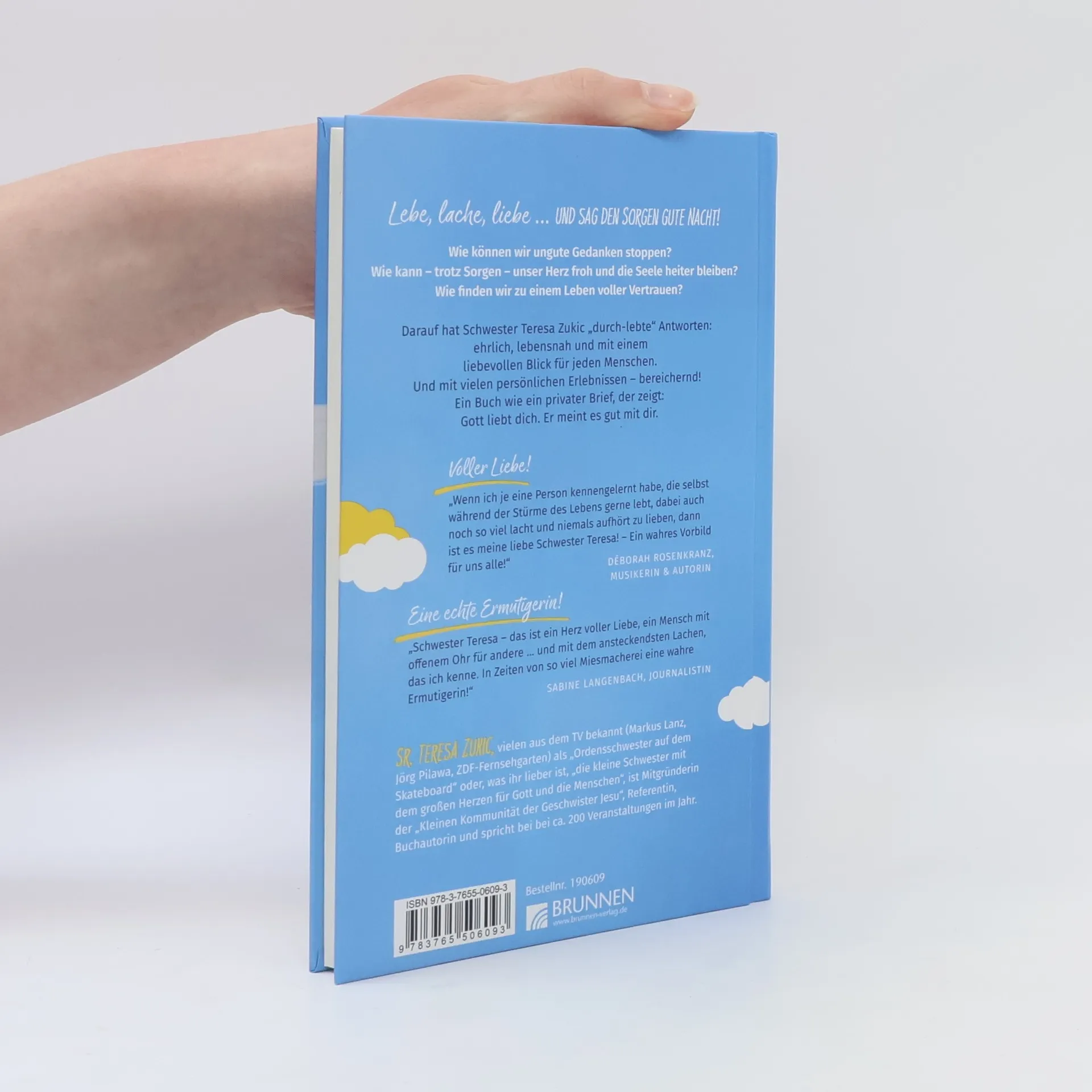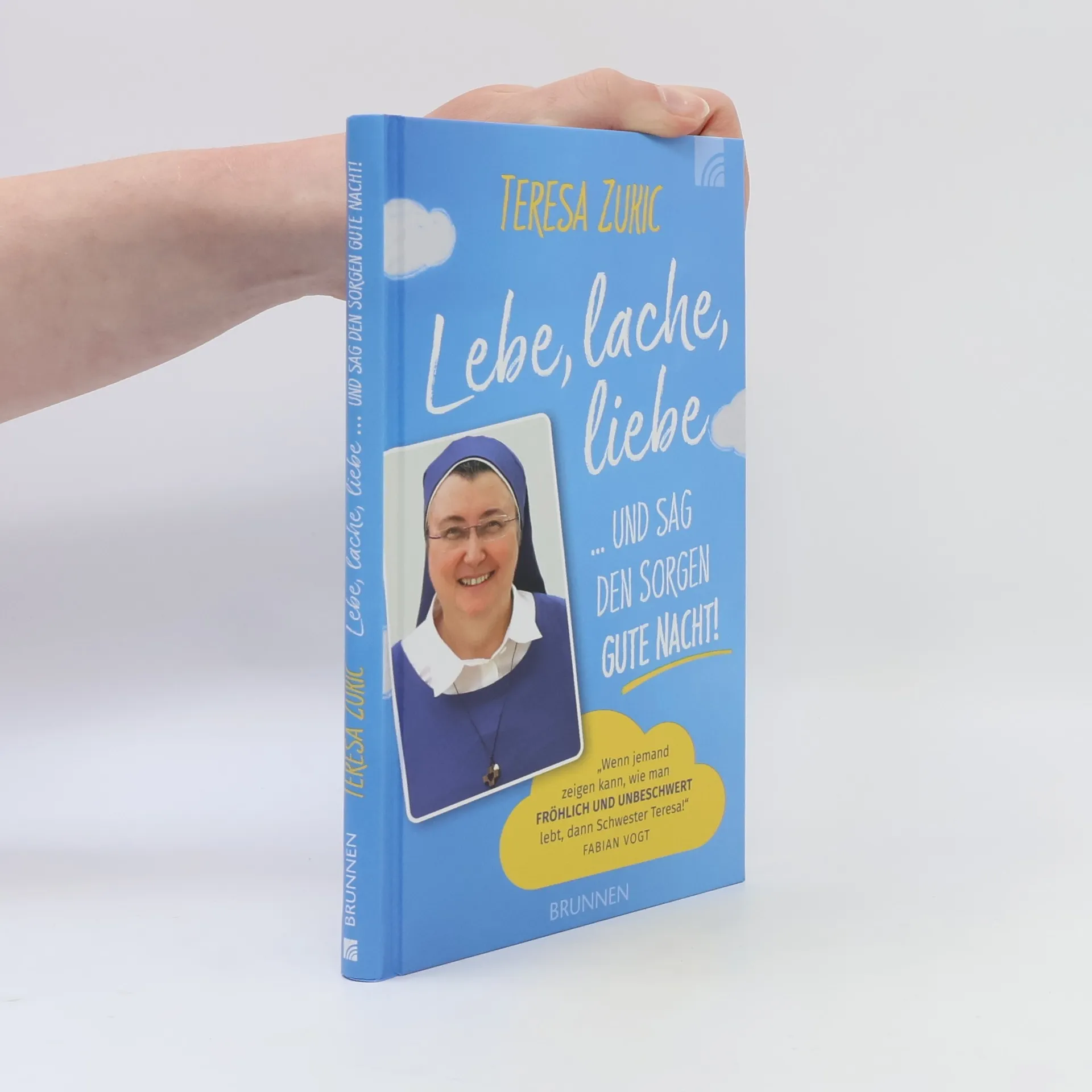 "Schwester Teresa macht sich Sorgen um die Sorgen. Zum Glück. Die meisten Menschen sorgen sich viel zu viel. Höchste Zeit, sich mit dem leidigen Phänomen des Sorgens mal ein bisschen intensiver zu beschäftigen. Und da ist Schwester Teresa genau die Richtige. Eine fromme Tausendsassa, die mit beiden Beinen auf dem Boden steht und dabei den Blick immer fest in den Himmel gerichtet hält. Vor allem aber schafft sie es auf eindrückliche Weise, dass einem bei so einem Thema das Lachen nicht vergeht, sondern die Seele heiter und das Herz froh wird.", so der Schriftsteller, Musiker, Kabarettist und Pfarrer Fabian Vogt über Teresa Zukics neues Buch. In "Lebe, lache, liebe ... und sag den Sorgen Gute Nacht!" beschreibt Teresa Zukic, wie es gelingen kann, die Macht unguter Gedanken zu stoppen, damit die Seele trotz aller Sorgen wieder heiter und das Herz froh wird. Und es geht um das Licht Gottes, das unsere Tage hell machen will.