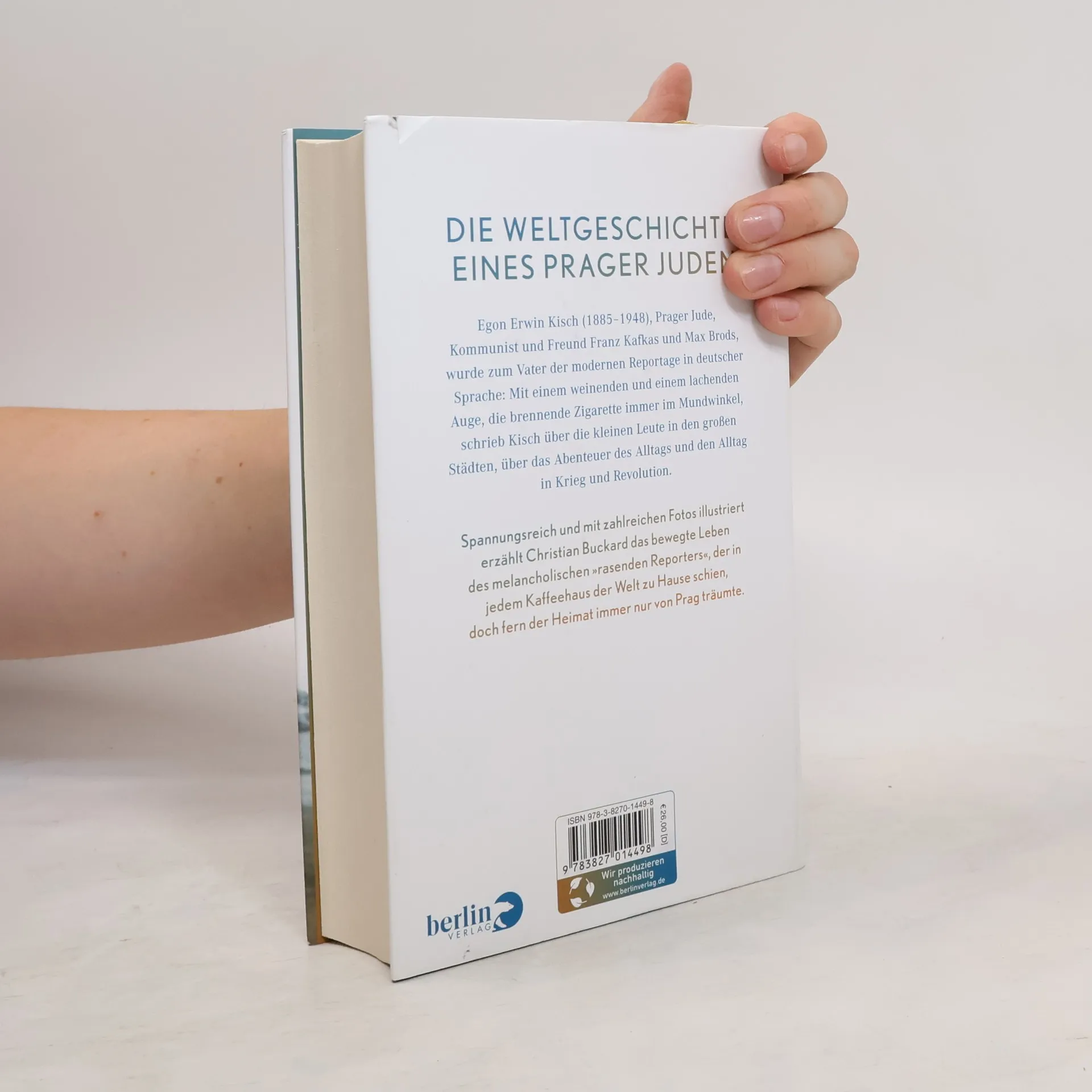 Die Weltgeschichte eines Prager Juden Egon Erwin Kisch (1885–1948), Prager Jude, Kommunist und Freund Franz Kafkas und Max Brods, wurde zum Vater der modernen Reportage in deutscher Sprache: Mit einem weinenden und einem lachenden Auge, die brennende Zigarette immer im Mundwinkel, schrieb Kisch über die kleinen Leute in den großen Städten, über das Abenteuer des Alltags und den Alltag in Krieg und Revolution. Das Leben des »rasenden Reporters« aus neuer Perspektive Spannungsreich und mit zahlreichen Fotos illustriert erzählt Christian Buckard das bewegte Leben des melancholischen »rasenden Reporters«, der in jedem Kaffeehaus der Welt zu Hause schien, doch fern der Heimat immer nur von Prag träumte. Zum 75. Todestag des Pioniers der modernen Reportage am 31. März 2023 Stimmen über Egon Erwin Kisch »Ich habe seine Reportagen verschlungen, die meisten auswendig gelernt. Für mich war Egon Erwin Kisch der 'Thomas Mann der Reportage'.« Billy Wilder »Sie sind mit dem Öl des wirklichen Erzählers gesalbt.« Alfred Döblin »Meiner Meinung nach kann man sich mit einem Fünftel Ihres Talents einen Nobelpreis zusammenschmieren, sofern man nichts von Ihrer Gesinnung mitbekommen hat.« Bertolt Brecht