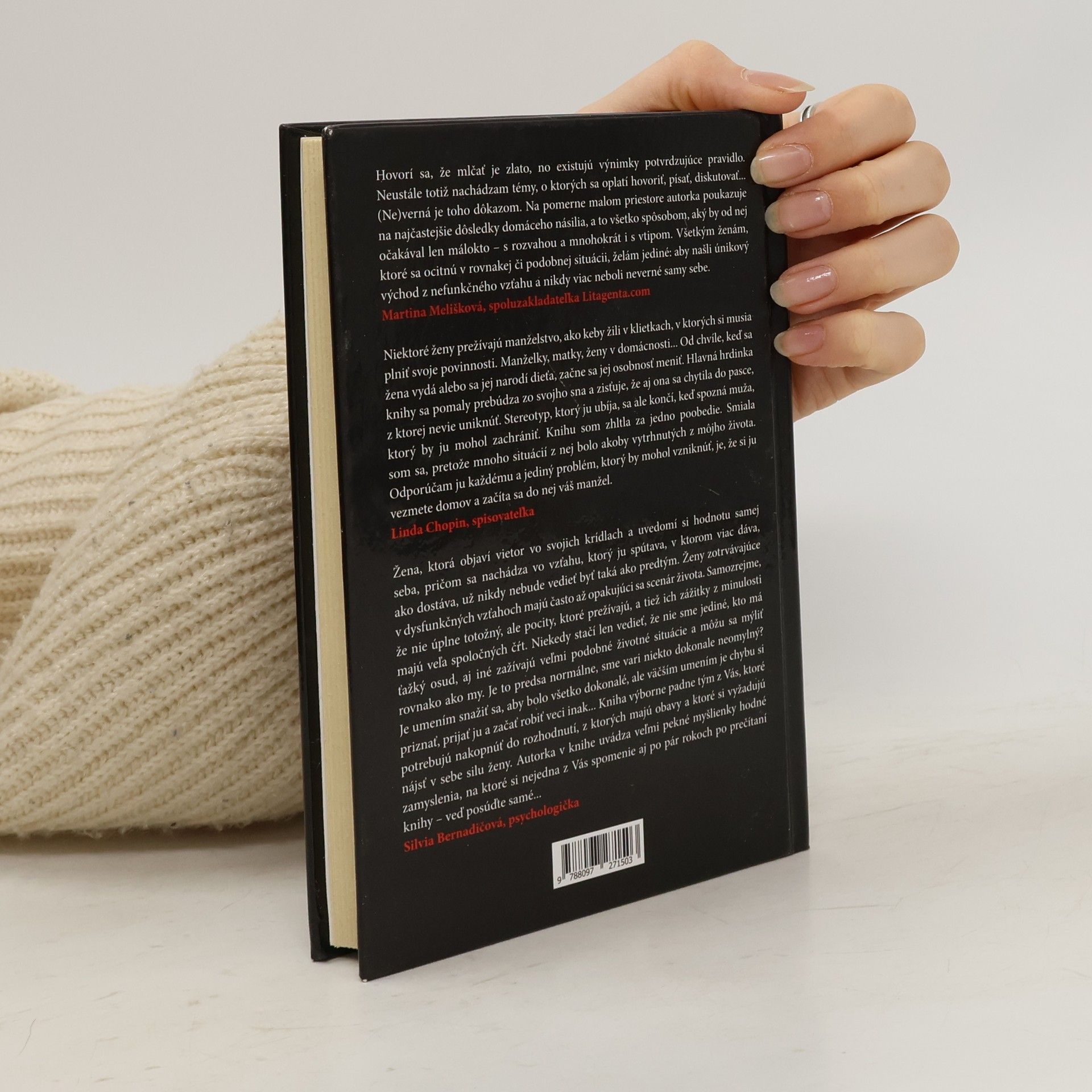 „Najhoršia je nevera, ktorú páchame sami na sebe.„ Príbeh ženy, ktorá stratila samu seba v každodennom živote. Príbeh o bolesti v duši, o mužoch v jej živote, o vášni, ktorá príde, keď ju najmenej čaká, o ľuďoch, ktorí jej zasiahli do života a nechali nemiznúcu stopu. Príbeh hlavnej hrdinky Dušany sa začína jej rozprávaním o detstve a význam tejto kapitoly sa postupne čitateľovi odkrýva v príbehu ženy, ktorá zomrela rukou svojho manžela a jej osoba sa v snoch objavuje Dušane. V čiastočne autobiografickom príbehu zohráva svoju úlohu aj Dušanin manžel Maroš, ktorý je jej prvou láskou, no ich vzájomný vzťah je ovplyvnený hádkami a domácim násilím. Linda, najlepšia priateľka hlavnej postavy, plní v knihe úlohu „svedomia“ hlavnej hrdinky, otvára jej oči a veľmi často hovorí veci, ktoré sa ťažko počúvajú. V hraničnom období, kedy je Dušana vyčerpaná zo situácie v domácnosti, no pred okolím hrá úlohu šťastnej manželky, sa stretáva s Danielom. Dokáže nájsť šťastie s ním?