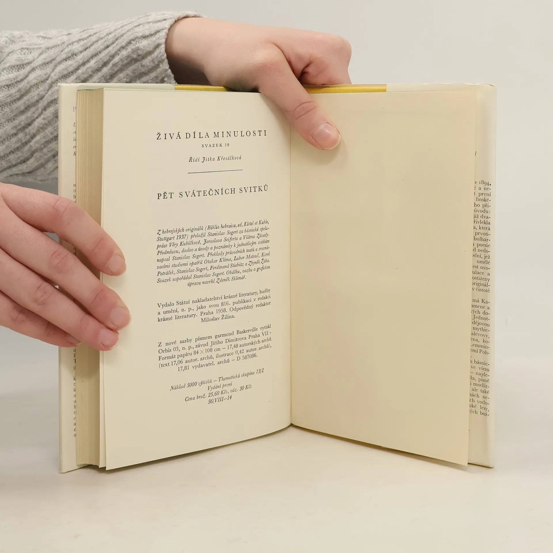 Do souboru pěti svátečních svitků je pojato pět děl staré hebrejské literatury, obsahově, slohově i formálně odlišných. V Písni písní jsou shrnuty starobylé hebrejské písně svatební, kniha Rút je prosté vyprávění o oddanosti opuštěné ženy. Žalozpěvy vyjadřují lítost nad zkázouměsta Jeruzaléma a jeho chrámu, kniha Kóhelet (Kazatel) přináší úvahy o pomíjejícnosti člověka, kniha Ester podává vzrušený děj odehrávající se na perském královském dvoře. Každý svitek je doprovázen úvodem, v němž jsou stručně probrány otázky týkající se jeho formy, vzniku, liturgického užití i osudu textu.