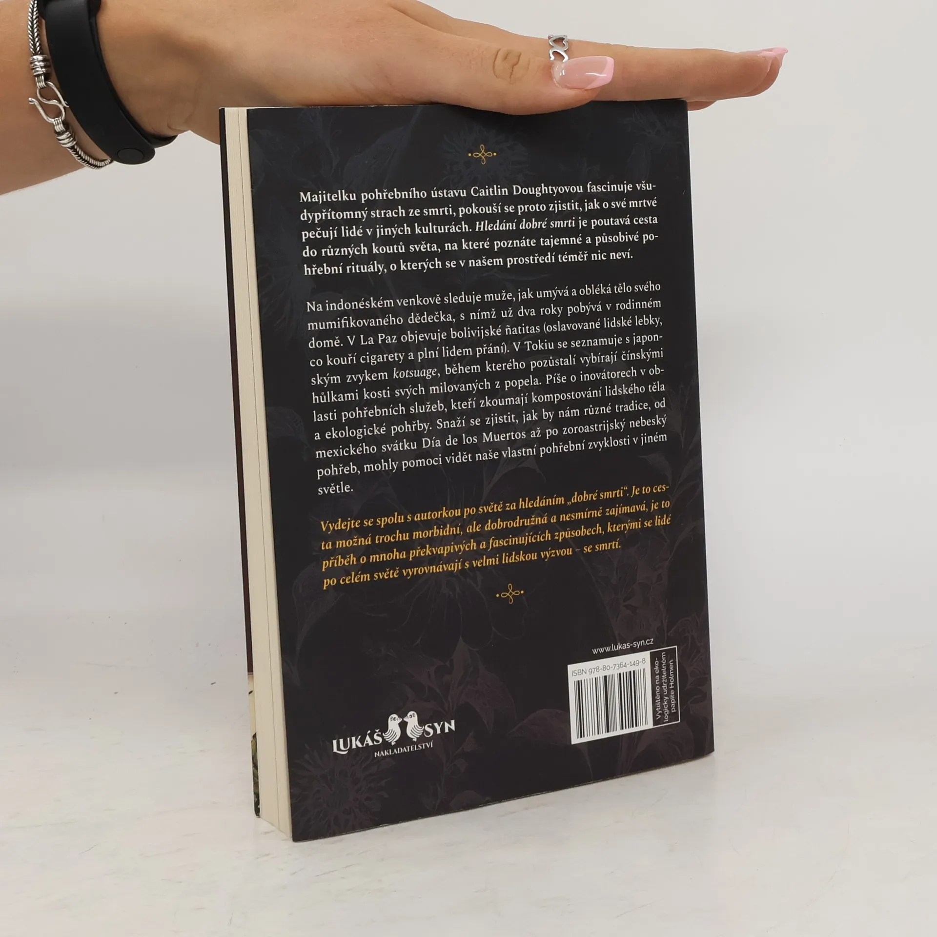 Majitelku pohřebního ústavu Caitlin Doughtyovou fascinuje všudypřítomný strach ze smrti, pokouší se proto zjistit, jak o své mrtvé pečují lidé v jiných kulturách. Hledání dobré smrti je poutavá cesta do různých koutů světa, na které poznáte tajemné a působivé pohřební rituály, o kterých se v našem prostředí téměř nic neví.Na indonéském venkově sleduje muže, jak umývá a obléká tělo svého mumifikovaného dědečka, s nímž už dva roky pobývá v rodinném domě. V La Paz objevuje bolivijské natitas (oslavované lidské lebky, co kouří cigarety a plní lidem přání). V Tokiu se seznamuje s japonským zvykem kotsuage, během kterého pozůstalí vybírají čínskými hůlkami kosti svých milovaných z popela. Píše o inovátorech v oblasti pohřebních služeb, kteří zkoumají kompostování lidského těla a ekologické pohřby. Snaží se zjistit, jak by nám různé tradice, od mexického svátku Día de los Muertos až po zoroastrijský nebeský pohřeb, mohly pomoci vidět naše vlastní pohřební zvyklosti v jiném světle.Vydejte se spolu s autorkou po světě za hledáním „dobré smrti“. Je to cesta možná trochu morbidní, ale dobrodružná a nesmírně zajímavá, je to příběh o mnoha překvapivých a fascinujících způsobech, kterými se lidé po celém světě vyrovnávají s velmi lidskou výzvou – se smrtí.