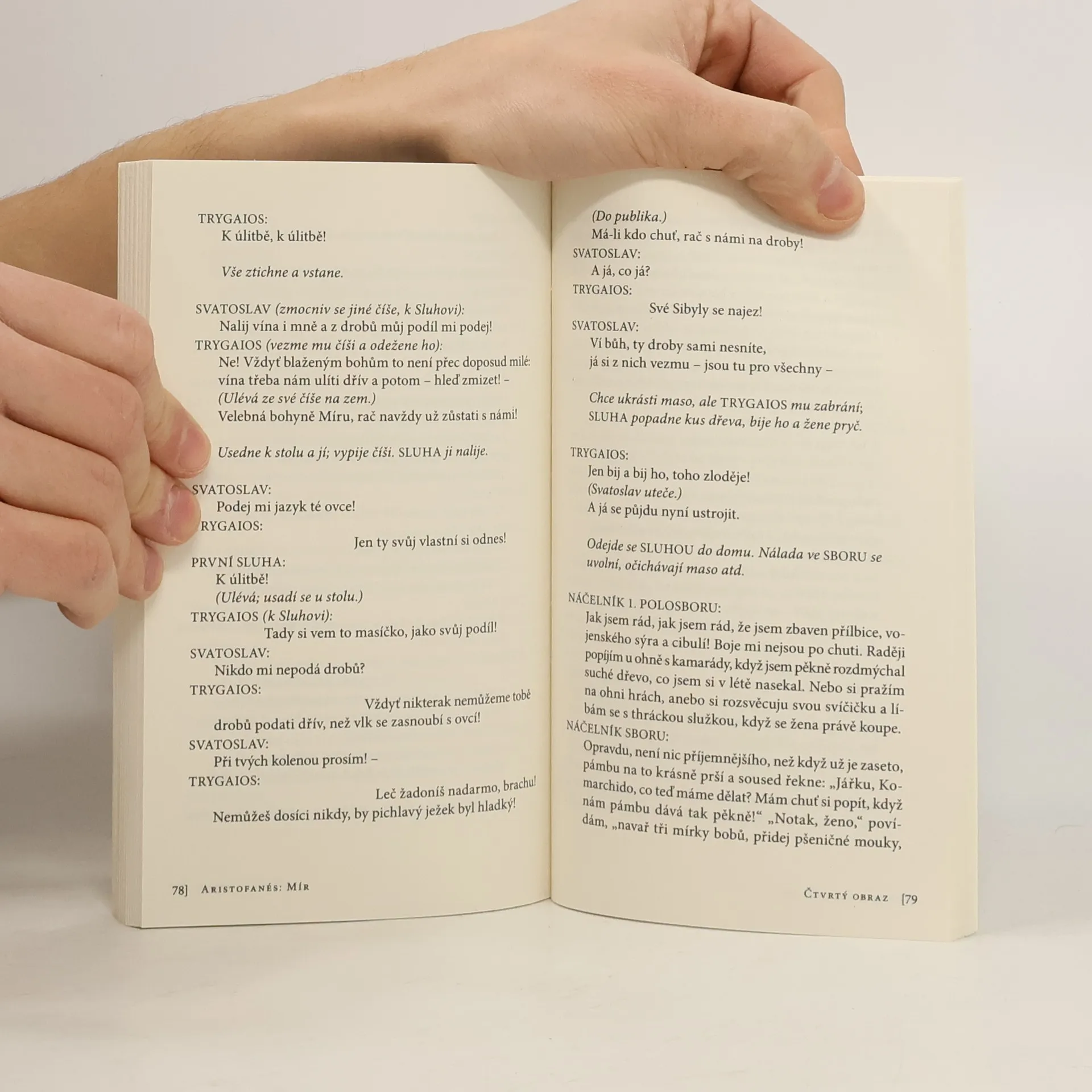 Komedie slavného starořeckého dramatika. Hrdinou hry je athénský vinař Trygaios, který se nikoli na Pegasu, jak by se slušelo, ale na hřbetě smrdutého obřího chrobáka vydá na Olymp, aby u Dia orodoval za ukončení války. Jeho satirický pohled míří na vojevůdce i politiky obou znesvářených zemí, nešetří ani bohy, kteří podlehnou "korupci". Nakladatelská anotace. Kráceno.