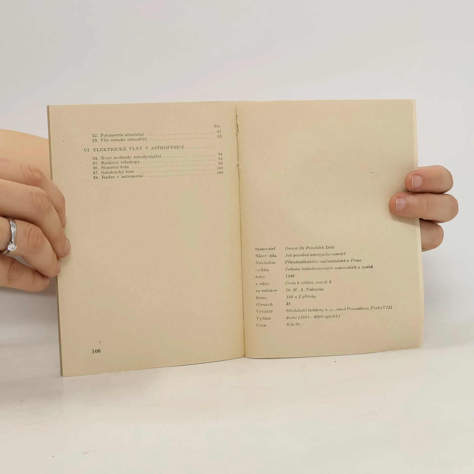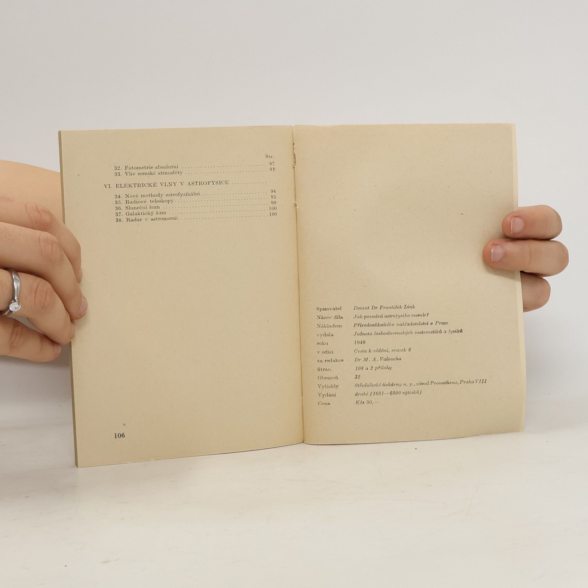 Předmětem zkoumání astrofysiky jsou fysikální a chemické jevy na tělesech nebeských, pramenem jejích poznatků jediné záření hvězd. Autor probírá metody astrofysiky (spektroskopii, fotografii, fotometrii),vysvětlujejejichprincipy,popisuje pomůcky a přístroje (dalekohledy, stereokomparátory, fotometry, pyrheliometry, radiometry a j.). V poslední kapitole zabývá se nejnovějšími metodami elektronickými, které spočívají v měření elektr.vlnvysílanýchnebeskýmitělesy pomocí radiových teleskopů, anebo v sondování hvězdných prostorů elektr. vlnami radarů. V závěru každé kapitoly ukládá čtenáři se znalostmi středoškolské matematiky kontrolní příklady k propočítání. Četné ilustrace v textu.