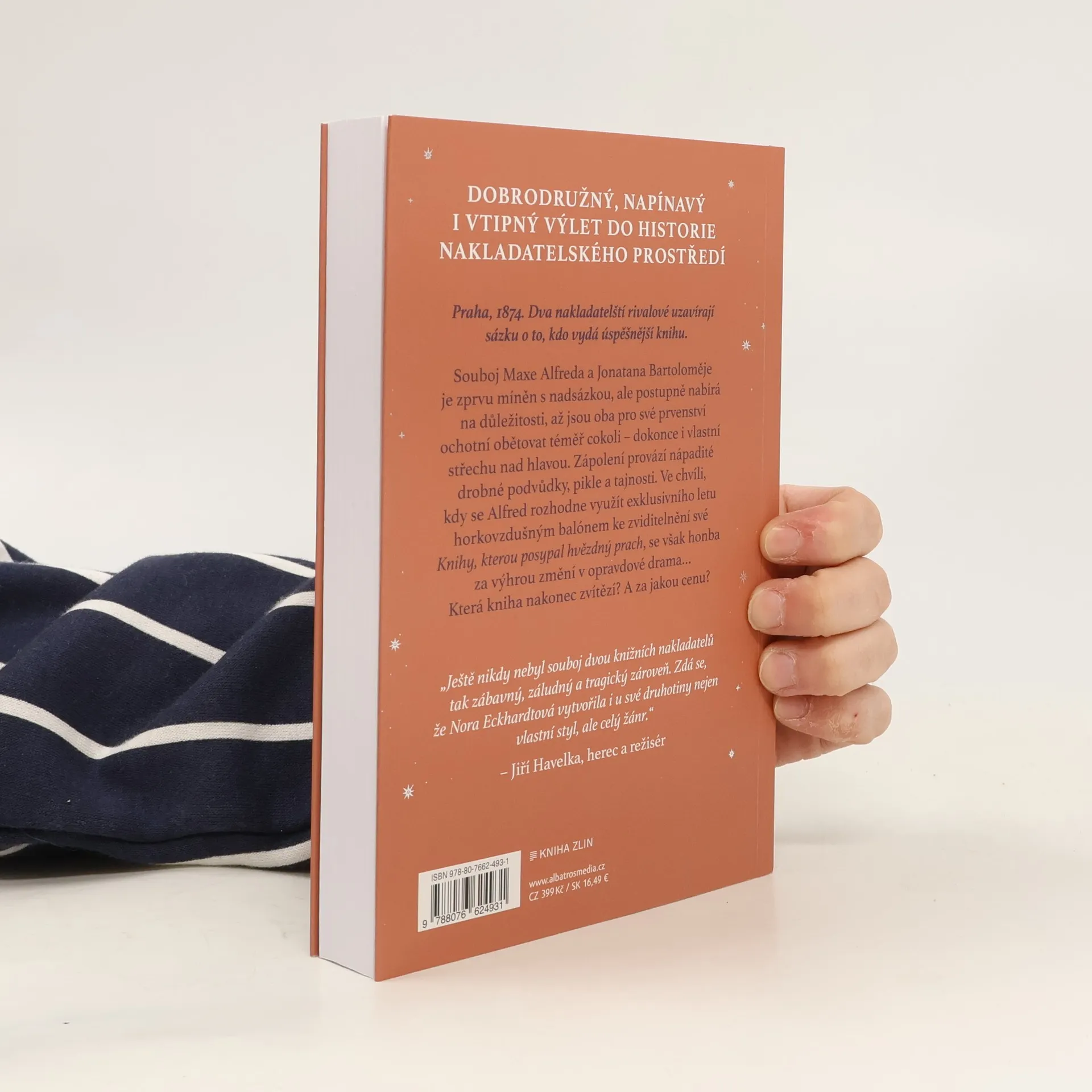 Dobrodružný, napínavý i vtipný výlet do historie nakladatelského prostředí.Praha, 1874. Dva nakladatelští rivalové uzavírají sázku o to, kdo vydá úspěšnější knihu. Souboj Maxe Alfreda a Jonatana Bartoloměje je zprvu míněn s nadsázkou, ale postupně nabírá na důležitosti, až jsou oba pro své prvenství ochotní obětovat téměř cokoli – i střechu nad hlavou. Zápolení provází drobné podvůdky, pikle a tajnosti. Ve chvíli, kdy se Alfred rozhodne využít exklusivního letu balónem ke zviditelnění své „Knihy, kterou posypal hvězdný prach“, se však honba za výhrou mění v opravdové drama…
