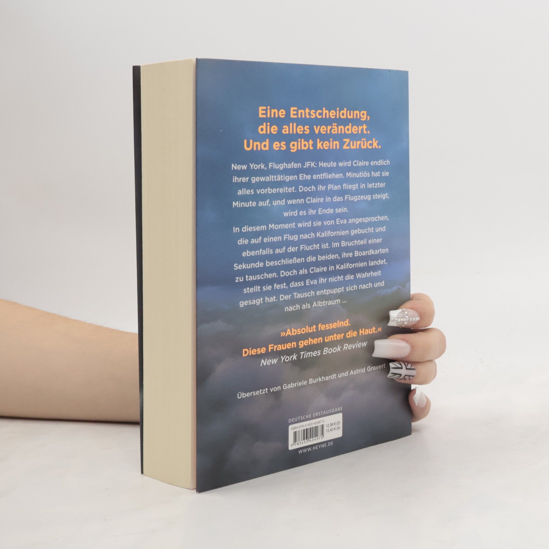 Zwei Frauen auf der Flucht. Eine Entscheidung, die alles verändert. Und kein Weg zurück. New York, Flughafen JFK: Claire soll nach Puerto Rico reisen, um ihren Mann, einen ehrgeizigen Politiker, beim Wahlkampf zu unterstützen. Doch in Wahrheit will sie nichts als fliehen – vor seinen gewalttätigen Übergriffen und der lückenlosen Kontrolle, die er über sie ausübt. Sie kommt mit Eva ins Gespräch, die bei ihrem schwerkranken Mann Sterbehilfe geleistet hat. Zu Hause in Kalifornien erwartet sie die Polizei. Innerhalb weniger Sekunden beschließen sie, die Bordkarten zu tauschen und sich gegenseitig ein neues Leben zu schenken.Erleichtert landet Claire in Kalifornien. In Evas Haus gibt es allerdings keine Hinweise auf einen Ehemann. Dann erfährt sie, dass das Flugzeug nach Puerto Rico abgestürzt ist. Und kurz darauf entdeckt sie die vermeintlich abgestürzte Eva in einer Fernsehreportage über das Unglück. Lebendig. Hat sie die Flucht in das Leben einer Anderen am Ende doch nur in eine Falle gelockt?