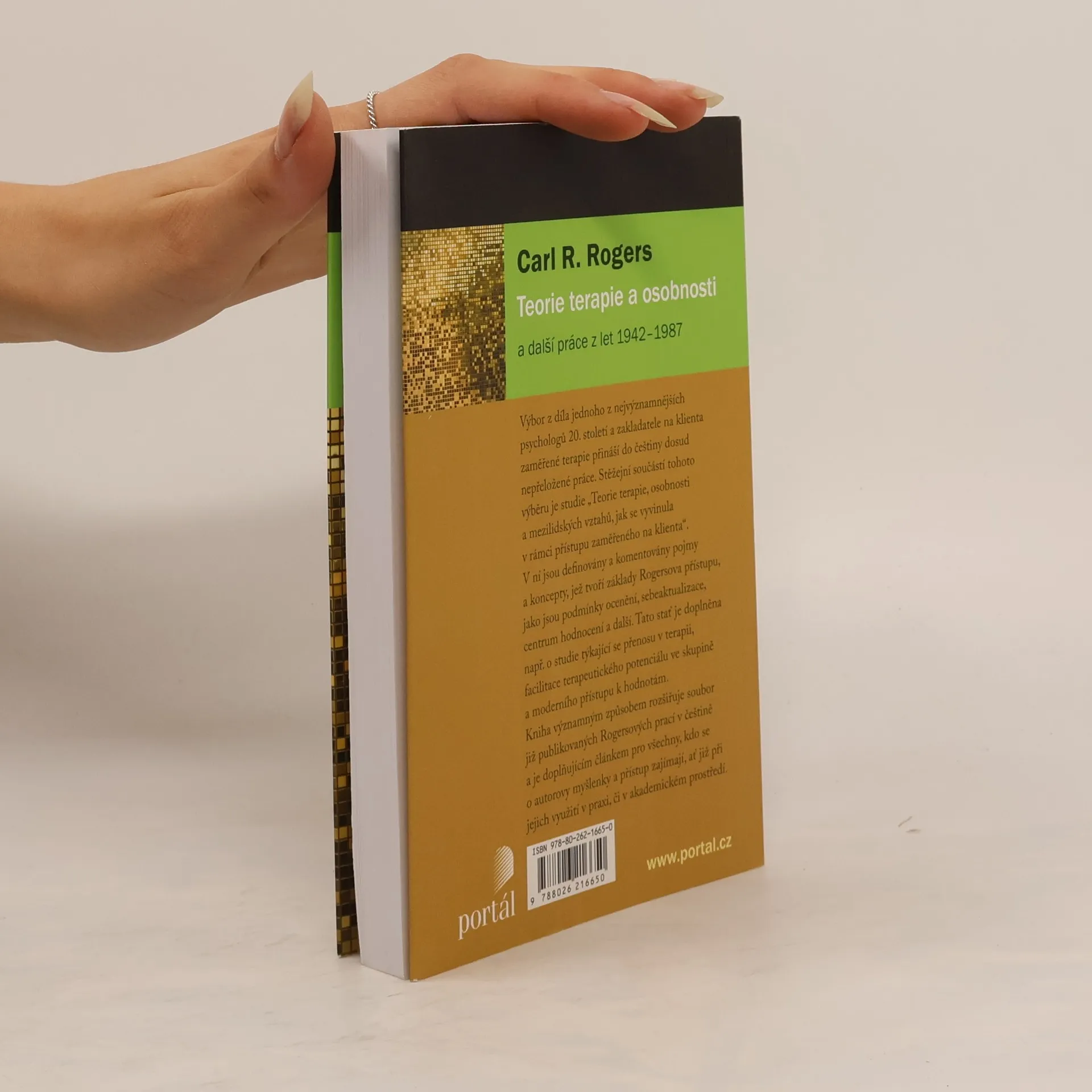 Výbor z díla jednoho z nejvýznamnějších psychologů 20. století a zakladatele na klienta zaměřené terapie přináší do češtiny dosud nepřeložené práce. Stěžejní součástí tohoto výběru je „Teorie terapie, osobnosti a interpersonálních vztahů, jak byla vyvinuta v rámci na klienta zaměřeného přístupu“. V ní jsou definovány a komentovány pojmy a koncepty, které tvoří základy Rogersova přístupu, jako jsou podmínky osobní hodnoty, intencionalita, místo hodnocení a další. Tato stať je doplněna o zamyšlení nad pocity a přenosem v terapii, facilitaci terapeutického potenciálu ve skupině, moderním přístupu k hodnotám, poznámku o přirozenosti člověka. Kniha významným způsobem rozšiřuje soubor již publikovaných prací a je doplňujícím článkem pro všechny, kdo se o Rogersovy myšlenky a přístup zajímají, ať již při jejich využití v praxi či vv akademickém prostředí. Carl Ransom Rogers (1902–1987) je zakladatel humanistické psychologie a „na klienta zaměřené“, „rozumějící“ psychoterapie. Vystudoval teologii, pedagogiku a psychologii, pracoval nejprve dvanáct let jako poradenský psycholog v Rochestru s delikventními a týranými dětmi. Později působil jako profesor psychologie na univerzitách v Ohiu, Chicagu a Wisconsinu