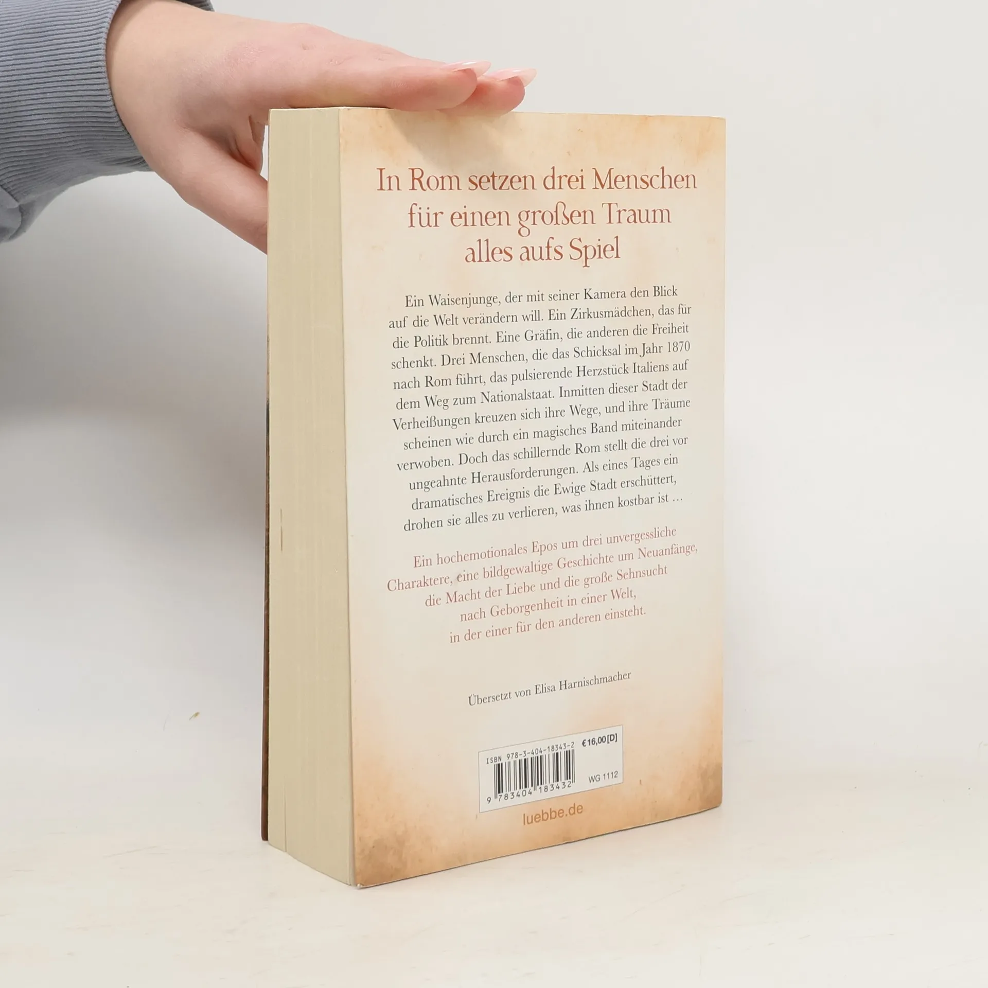 Ein Waisenjunge, der mit seiner Kamera den Blick auf die Welt verändern will. Ein Zirkusmädchen, das für die Politik brennt. Eine Gräfin, die anderen die Freiheit schenkt. Drei Menschen, die das Schicksal im Jahr 1870 nach Rom führt, das pulsierende Herzstück Italiens auf dem Weg zum Nationalstaat. Inmitten dieser Stadt der Verheißungen kreuzen sich ihre Wege, und ihre Träume scheinen wie durch ein magisches Band miteinander verwoben. Doch das schillernde Rom stellt die drei vor ungeahnte Herausforderungen. Als eines Tages ein dramatisches Ereignis die Ewige Stadt erschüttert, drohen sie alles zu verlieren, was ihnen kostbar ist ...