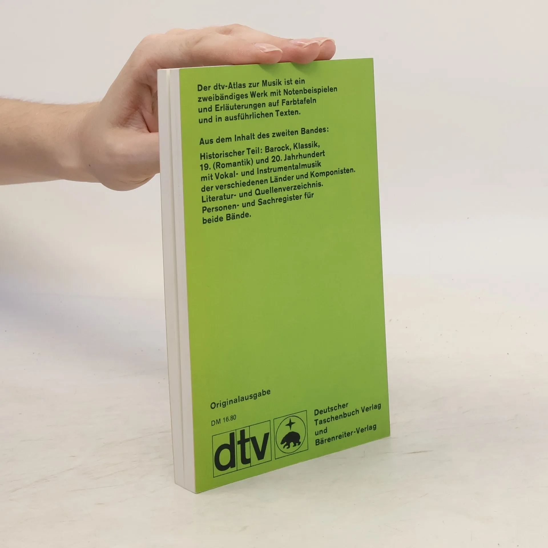 Mit 130 Abbildungsseiten in Farbe Grafische Gestaltung: Gunther Vogel   Der in zwei Bänden vorliegende ›dtv-Atlas Musik‹ gibt einen Überblick über die Grundlagen und die Geschichte der Musik. Gegliedert ist dieses auch als Nachschlagewerk zu benutzende Kompendium in einen systematischen und einen historischen Teil, wobei der Schwerpunkt auf der Geschichte liegt. Der zweite Band, der innerhalb der Sachgebiete chronologisch geordnet ist, behandelt die Zeit vom Barock bis zur Gegenwart. Mit vielen Notenbeispielen und durchgehend farbig! Aus dem Inhalt des zweiten Bandes: Historischer Teil: Barock. Klassik. 19. (Romantik) und 20. Jahrhundert mit Vokal- und Instrumentalmusik der verschiedenen Länder und Komponisten. Mit Literaturverzeichnis und Register für beide Bände.