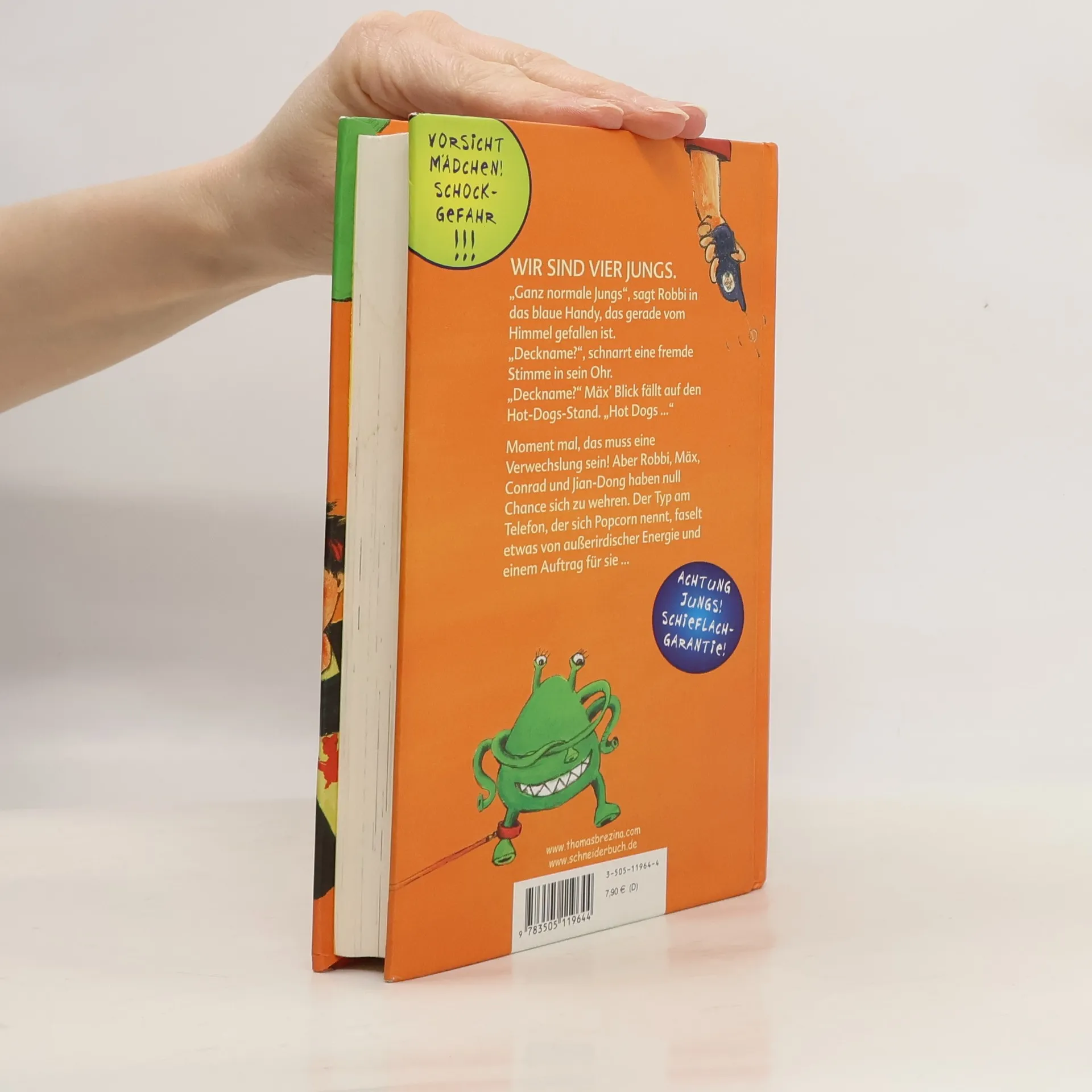 Wir sind vier Jungs. "Ganz normale Jungs", sagt Robbi in das blaue Handy, das gerade vom Himmel gefallen ist. "Deckname?" schnarrt eine fremde Stimme in sein Ohr. "Deckname?" Mäx' Blick fällt auf den Hot-Dog-Stand. "Hot Dogs ..." Moment mal, das muss eine Verwechslung sein! Aber Robbi, Mäx, Conrad und Jian-Dong haben null Chance sich zu wehren. Der Typ am Telefon, der sich Popcorn nennt, faselt etwas von außerirdischer Energie und einem Auftrag für sie ...