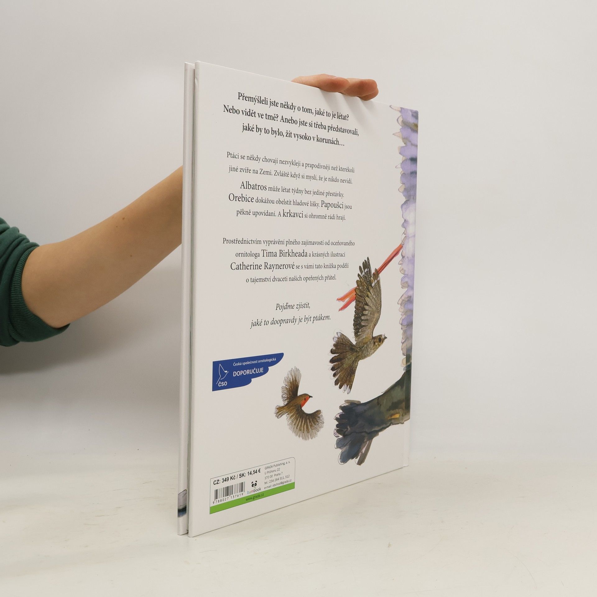 Ptáci se někdy chovají nezvykleji a prapodivněji než kterékoli jiné zvíře na Zemi. Zvláště když si myslí, že je nikdo nevidí. Albatros může létat týdny bez jediné přestávky. Orebice dokážou obelstít hladové lišky. Papoušci jsou pěkně upovídaní. A krkavci si ohromně rádi hrají. Prostřednictvím vyprávění plného zajímavostí od oceňovaného ornitologa Tima Birkheada a krásných ilustrací Catherine Raynerové se s vámi tato knížka podělí o tajemství dvaceti našich opeřených přátel.Pojďme zjistit, jaké to doopravdy je být ptákem.