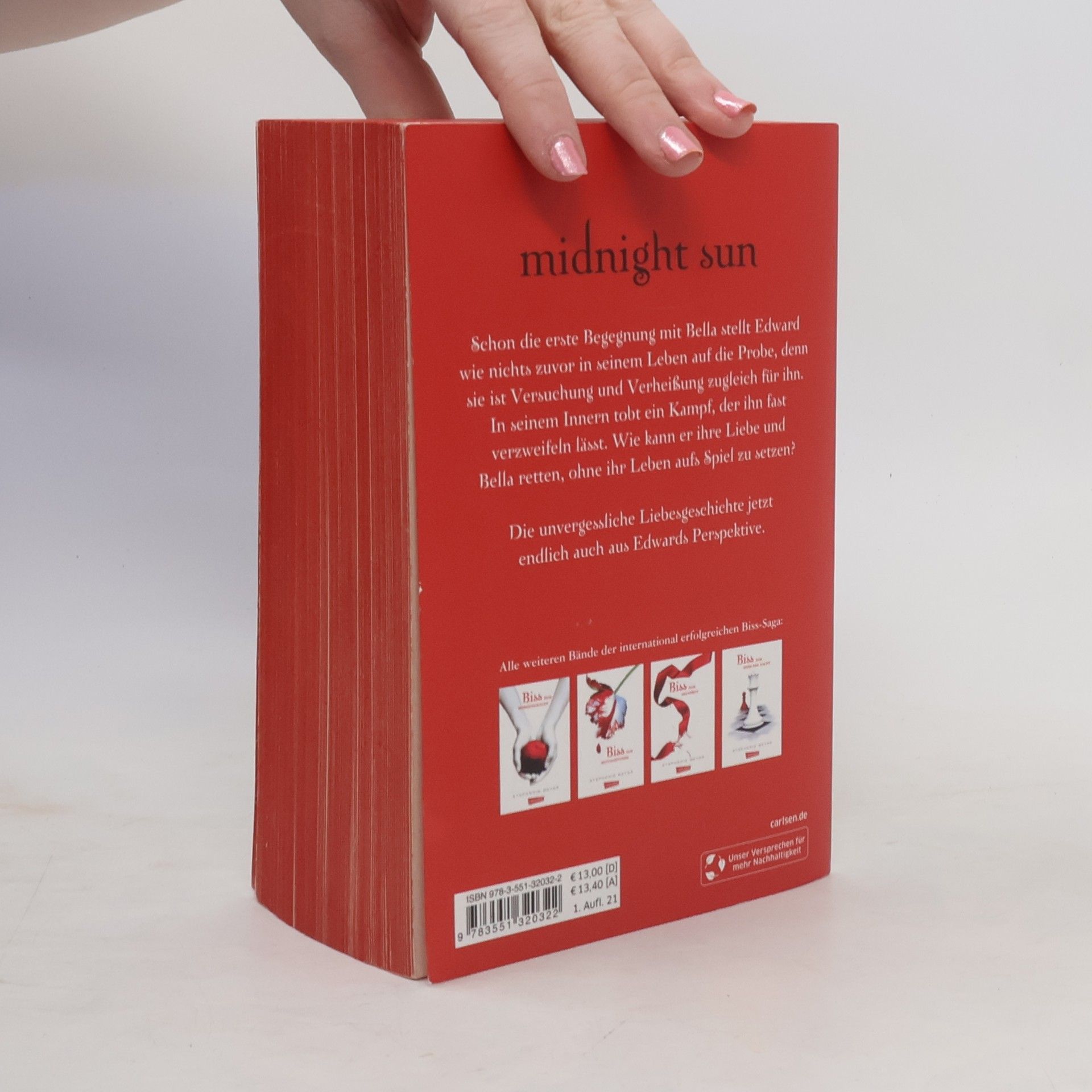 Endlich Neues von Biss-Autorin Stephenie Meyer. Ihre TWILIGHT-Liebesromane standen über Wochen auf den Spiegel-Bestsellerlisten. Millionen von Leser*innen haben sich mit Bella in Edward verliebt. Jetzt nimmt Edward sie mit in die Tiefen seiner dunklen Vergangenheit. Die Geschichte von Bella und Edward ist weltberühmt! Doch bisher kennen Leser*innen nur Bellas Blick auf diese betörende Liebe gegen jede Vernunft. In Biss zur Mitternachtssonne erzählt nun endlich Edward von ihrer ersten Begegnung, die ihn wie nichts zuvor in seinem Leben auf die Probe stellt, denn Bella ist zugleich Versuchung und Verheißung für ihn. Der Kampf, der in seinem Innern tobt, um sie und ihre Liebe zu retten, verleiht dieser unvergesslichen Geschichte einen neuen, dunkleren Ton. Alle Bände der international erfolgreichen »Biss«-Saga auf einen Blick: Biss zum Morgengrauen Biss zur Mittagsstunde Biss zum Abendrot Biss zum Ende der Nacht Biss zur Mitternachtssonne Biss zum ersten Sonnenstrahl – Das kurze zweite Leben der Bree Tanner Ein Muss für alle Fantasy-Romance-Fans und eine berauschende Liebesgeschichte, die unter die Haut geht.