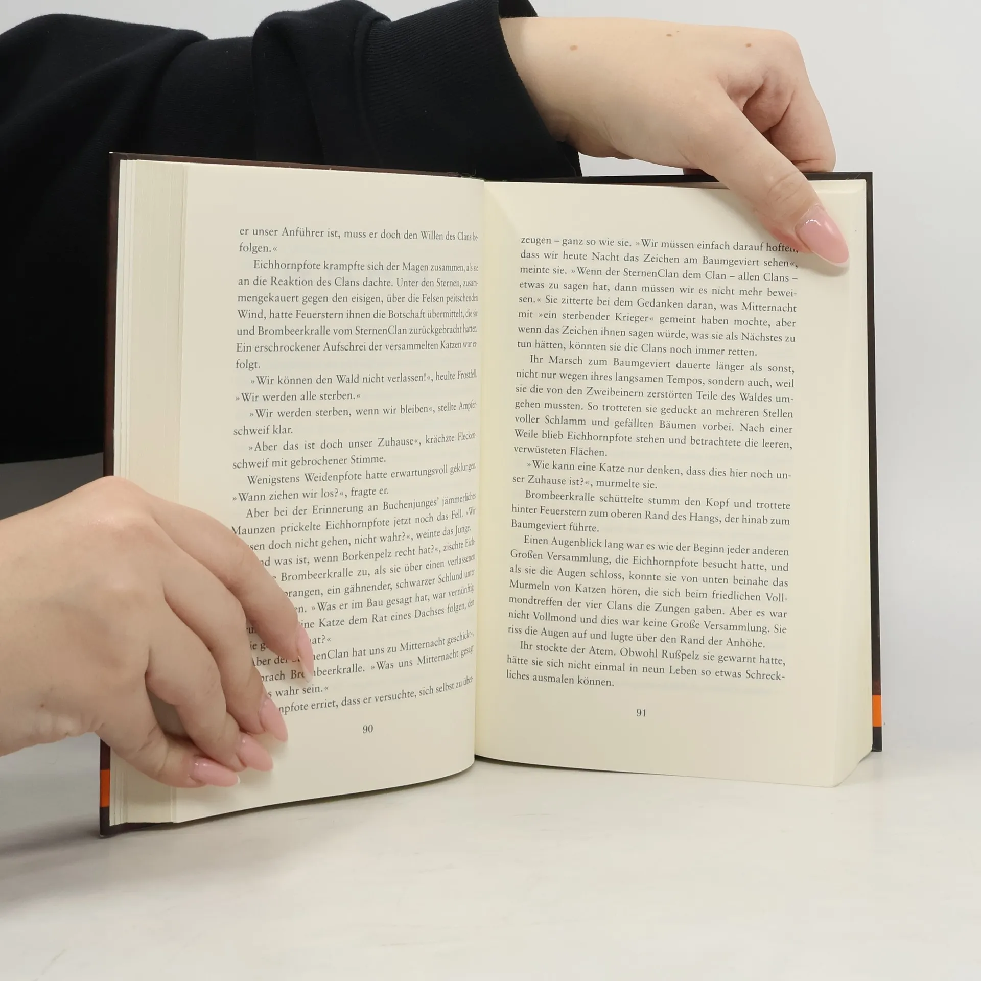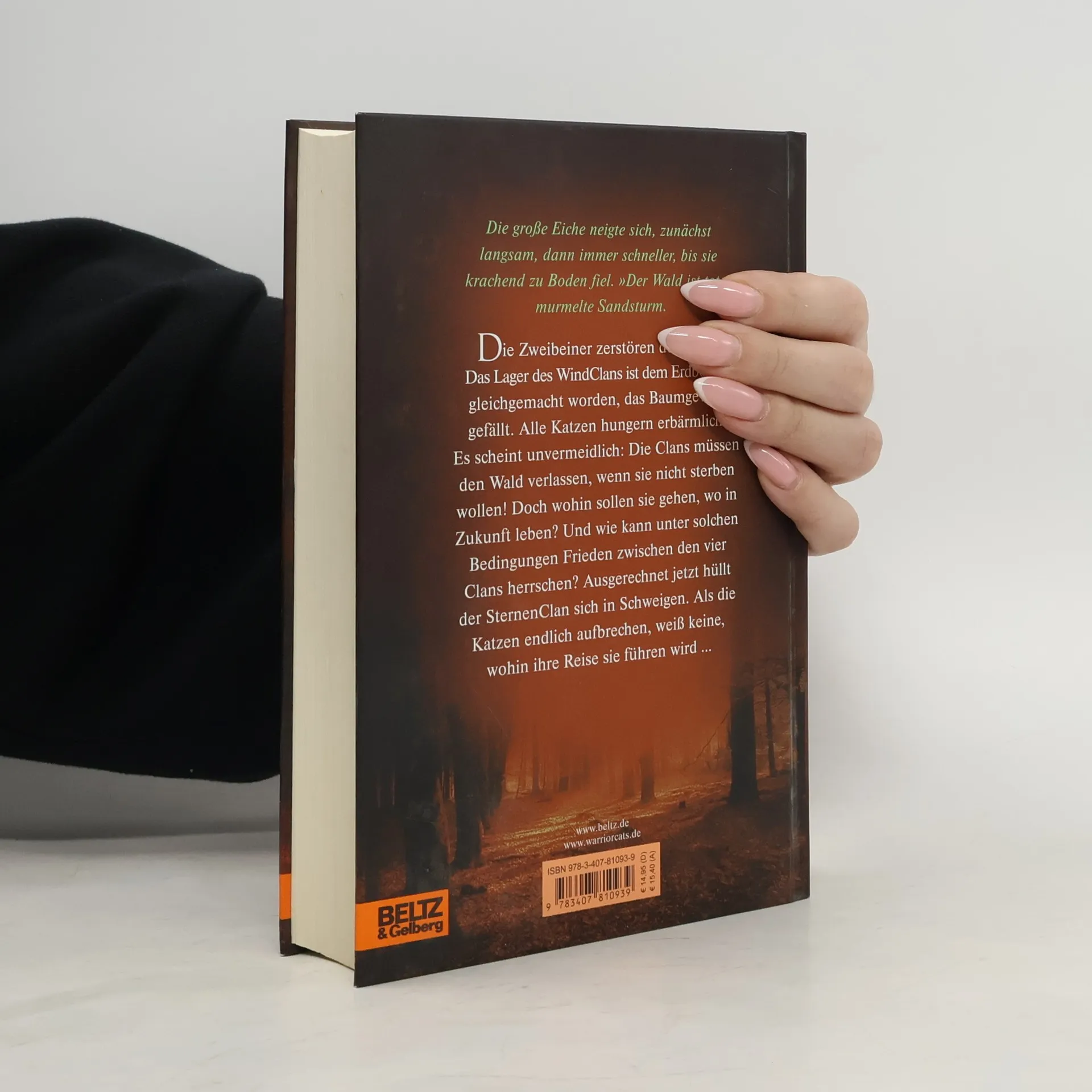 Die große Eiche neigte sich, zunächst langsam, dann immer schneller. bis sie krachend zu Boden fiel. »Der Wald ist tot«, murmelte Sandsturm. »Für keinen von uns besteht noch Hoffnung.« Die Zweibeiner zerstören den Wald: Das Lager des DonnerClans ist dem Erdboden gleichgemacht worden, das Baumgeviert, der rituelle Versammlungsort der vier Clans, gefällt. Alle Katzen hungern erbärmlich. Es scheint unvermeindlich: Die Katzen müssen den Wald verlassen, wenn sie nicht sterben wollen! Doch wohin sollen sie gehen, wo sollen sie in Zukunft leben? Und wie kann unter solchen Bedingungen Frieden zwischen den vier Clans herrschen? Ausgerechnet jetzt hüllt der SternenClan sich in Schweigen. Als die Katzen endlich aufbrechen, weiß keine, wohin ihre Reise sie führen wird ...