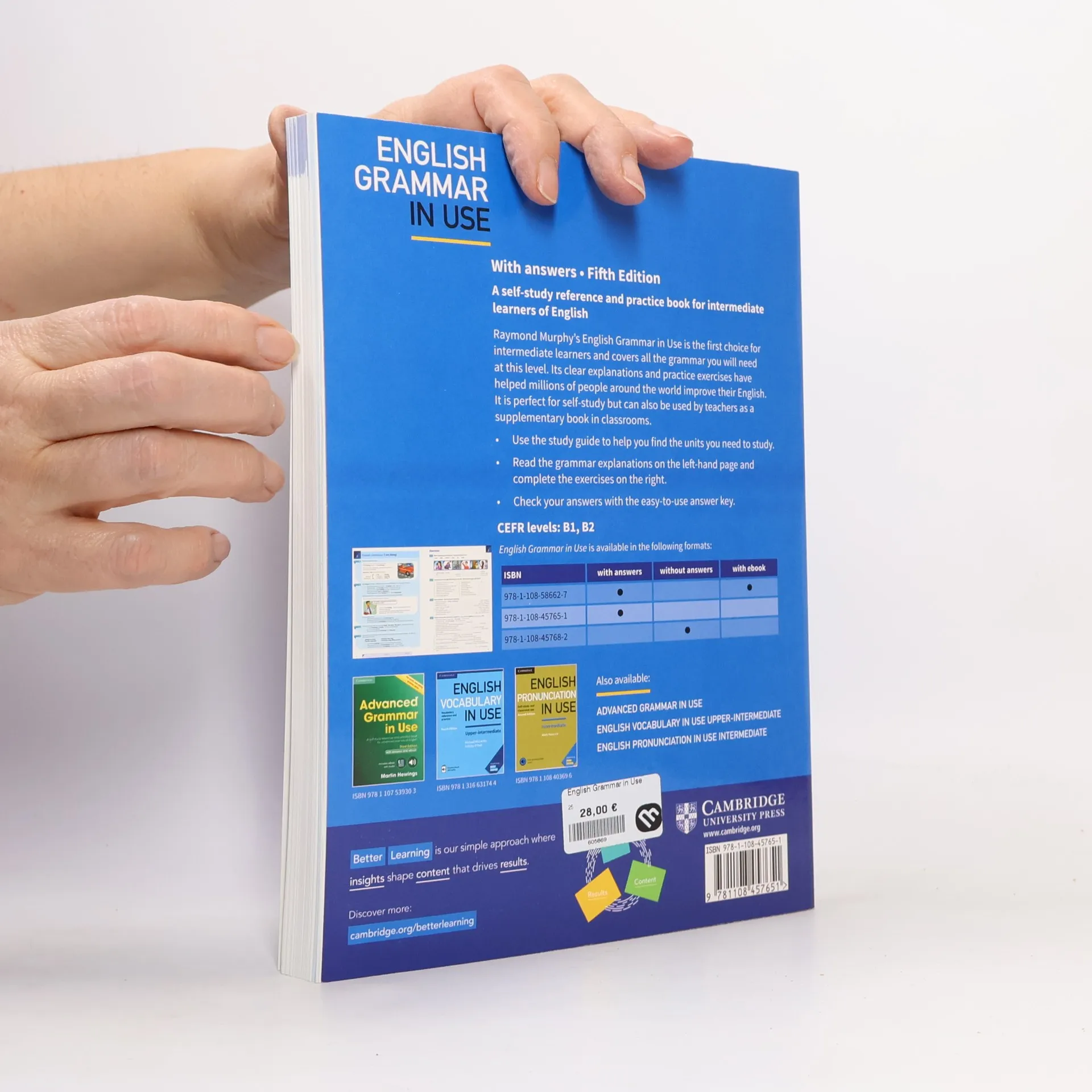 Raymond Murphy's English Grammar in Use is the first choice for intermediate (B1-B2) learners and covers all the grammar you will need at this level. This book with answers has clear explanations and practice exercises that have helped millions of people around the world improve their English. It is perfect for self-study and can also be used by teachers as a supplementary book in classrooms.