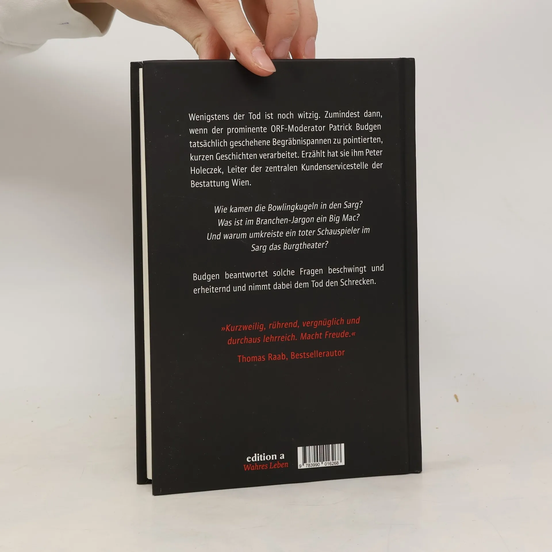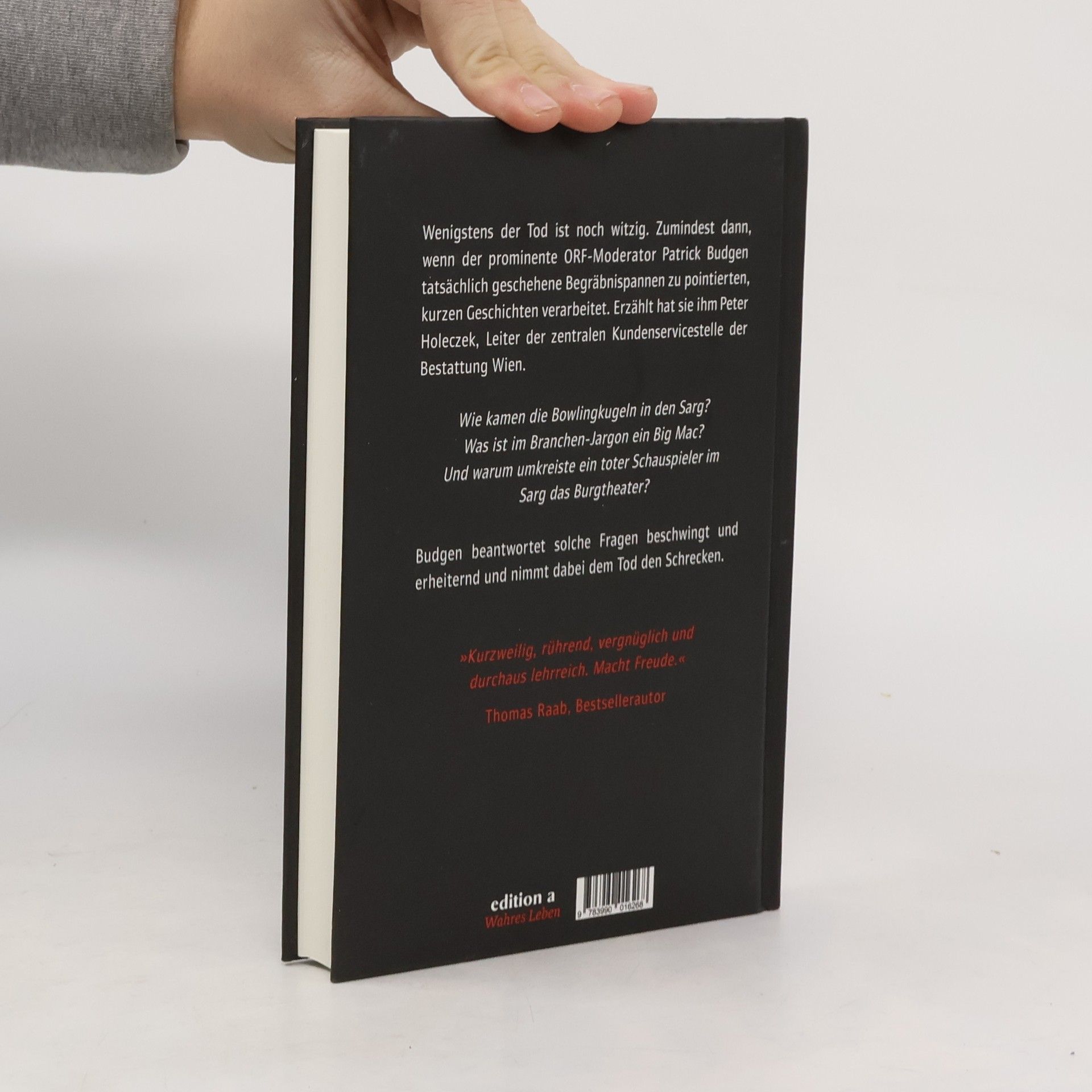 Wenigstens der Tod ist noch witzig. Zumindest dann, wenn der prominente ORF-Moderator Patrick Budgen tatsächlich geschehene Begräbnispannen zu pointierten, kurzen Geschichten verarbeitet. Erzählt hat sie ihm Peter Holeczek, Leiter der zentralen Kundenservicestelle der Bestattung Wien. Wie kamen die Bowlingkugeln in den Sarg? Was ist im Branchen-Jargon ein Big Mac? Und warum umkreiste ein toter Schauspieler im Sarg das Burgtheater? Budgen beantwortet solche Fragen beschwingt und erheiternd und nimmt dabei dem Tod den Schrecken.