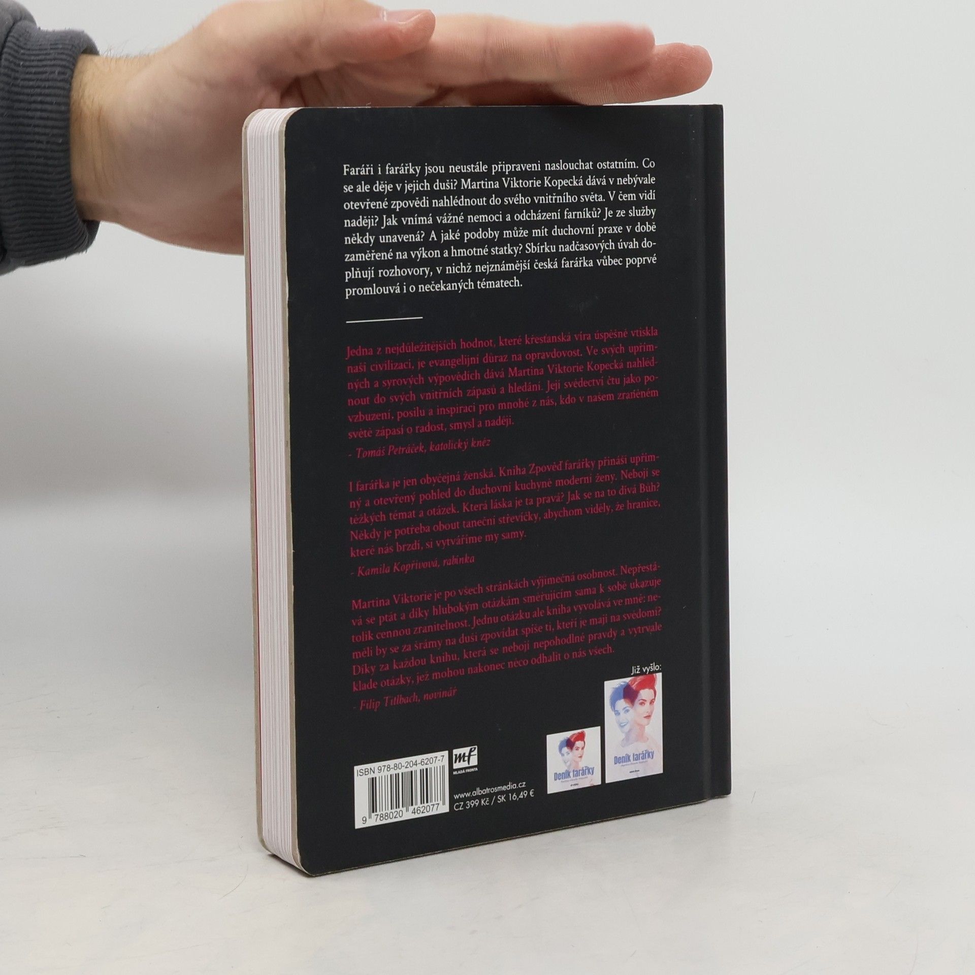 O životě farářky už jste četli. Teď se připravte na cestu do jejího nitra. Faráři i farářky jsou neustále připraveni naslouchat ostatním. Co se ale děje v jejich duši? Martina Viktorie Kopecká dává v nebývale otevřené zpovědi nahlédnout do svého vnitřního světa. Co si myslí o celibátu a založení rodiny? Jak vnímá vážné nemoci a odcházení svých farníků? Je ze služby někdy unavená? A jaké podoby může mít duchovní praxe v době zaměřené na výkon a hmotné statky? Sbírku nadčasových úvah doplňují rozhovory, v nichž nejznámější česká farářka vůbec poprvé promlouvá i o nečekaných tématech.