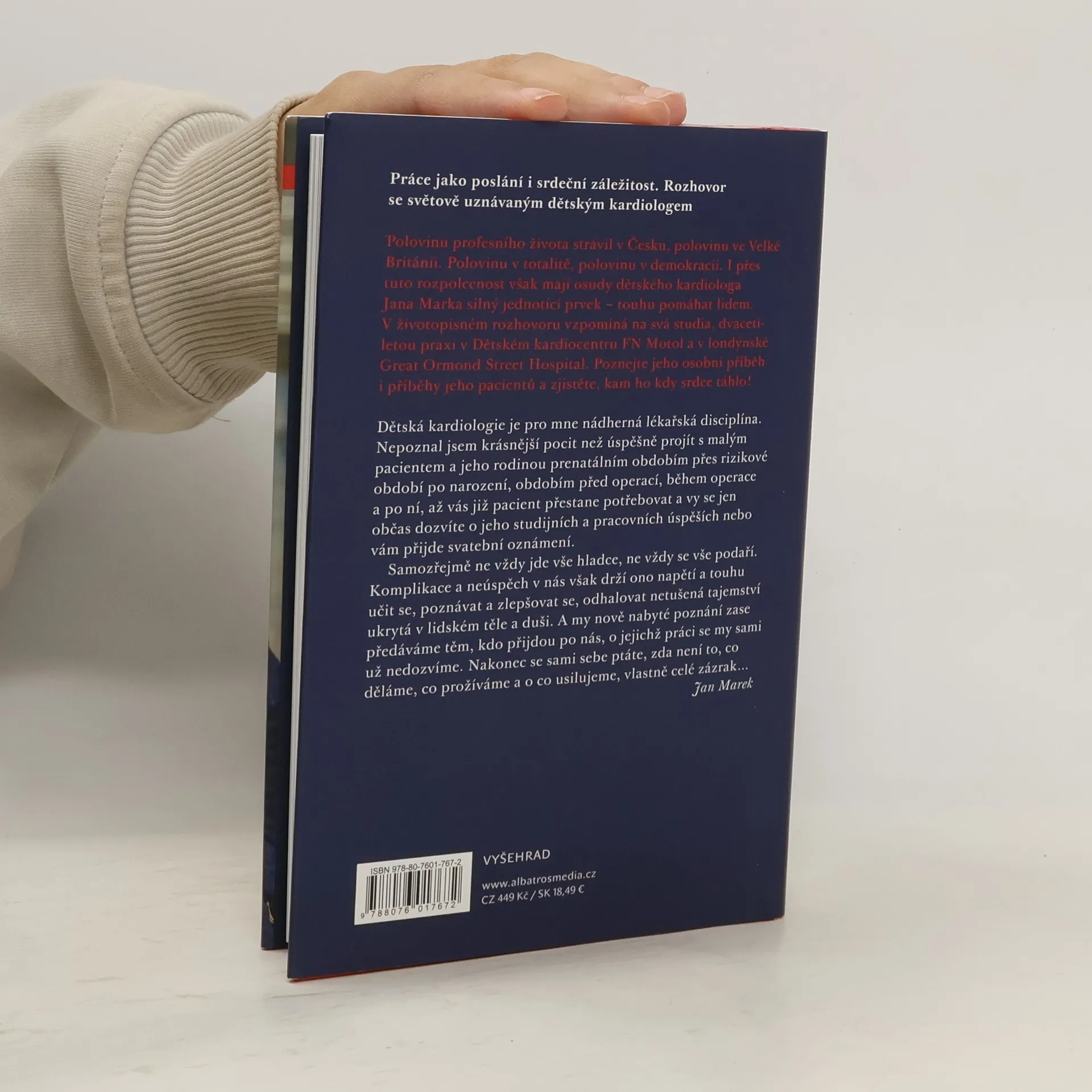 Knižní rozhovor s dětským kardiologem prof. Janem Markem nese příznačný název "Srdce napůl". Jan Marek totiž strávil polovinu svého profesního života v Česku (resp. Československu) a polovinu ve Velké Británii, polovinu prožil v totalitě a druhou polovinu žije v demokracii. Vystudoval 2. Lékařskou fakultu Univerzity Karlovy v Praze, postgraduální výuku absolvoval částečně v Houstonu a Torontu. Dvacet let pracoval v Dětském kardiocentru Fakultní nemocnice Motol, kde vedl pracoviště Echokardiografie a prenatální kardiologie. Podílel se na vzniku a rozvoji prenatálního screeningu vrozených srdečních vad v Československu a České republice, a moderní diagnostické metody v kardiologii pak pomáhal zavádět v řadě zemí světa. V roce 2005 nastoupil do oddělení neinvazivní diagnostiky a prenatální kardiologie v Great Ormond Street Hospital v Londýně, kde působí jako vedoucí konzultant. Jan Marek je profesorem na University College London a na Karlově univerzitě v Praze. Působí též v pražském soukromém zdravotnickém zařízení Canadian Medical, kde se věnuje klinické dětské a prenatální kardiologii a je konzultantem pro pacienty s vrozenými srdečními vadami od prenatálního období do dospělosti. Rozhovor s profesorem Markem vedl novinář Petr Andreas, který má na kontě četné rozhovory s lékaři, vědci a umělci.