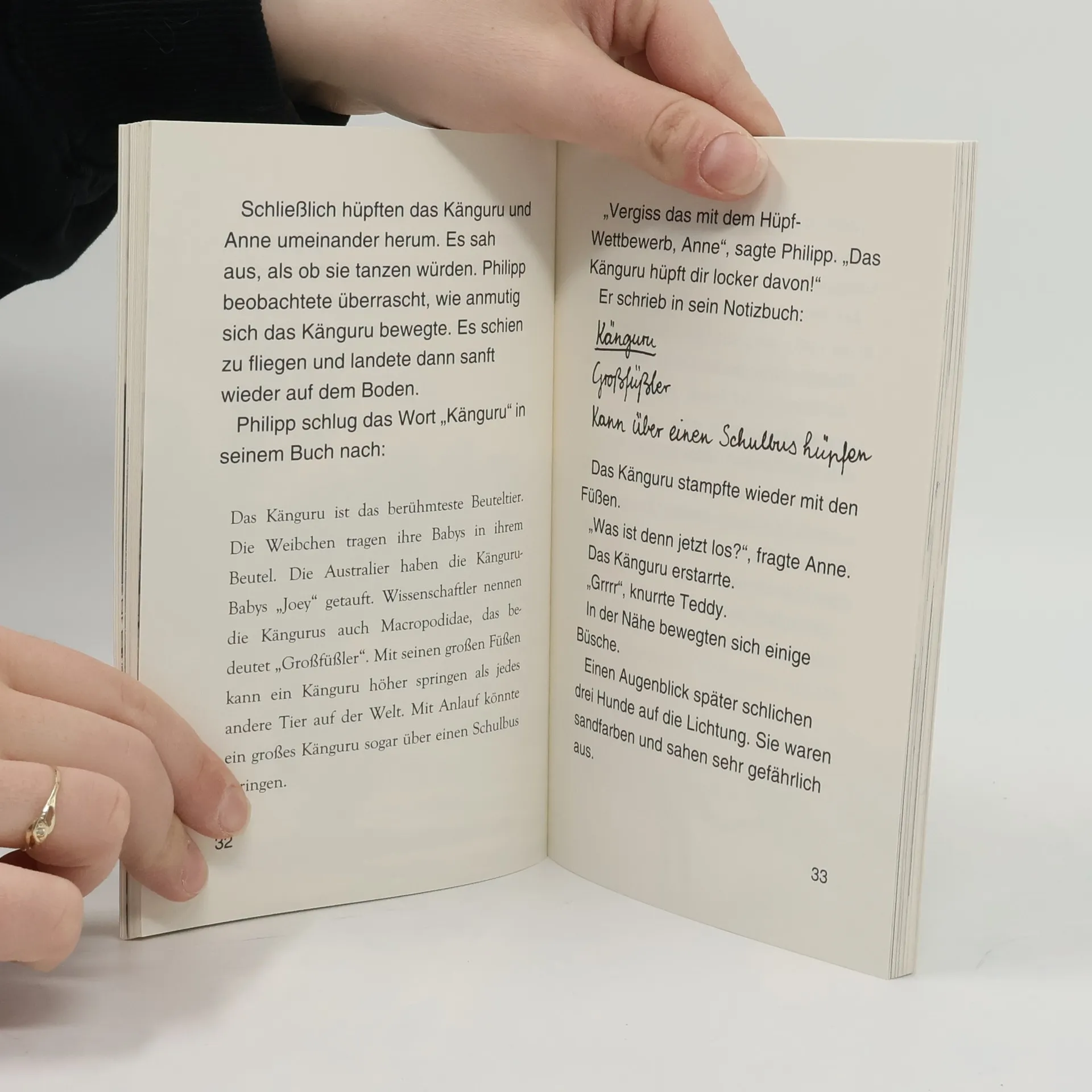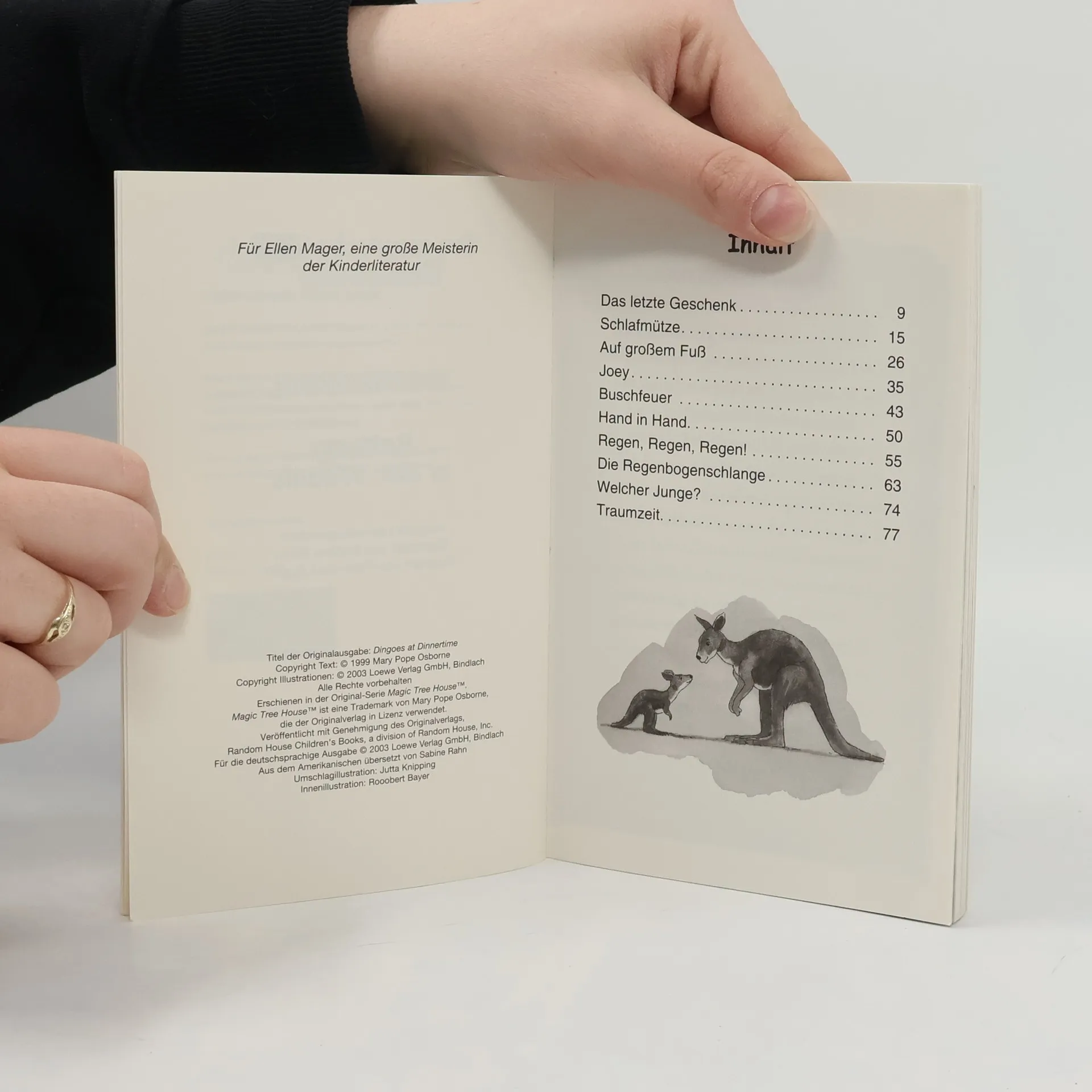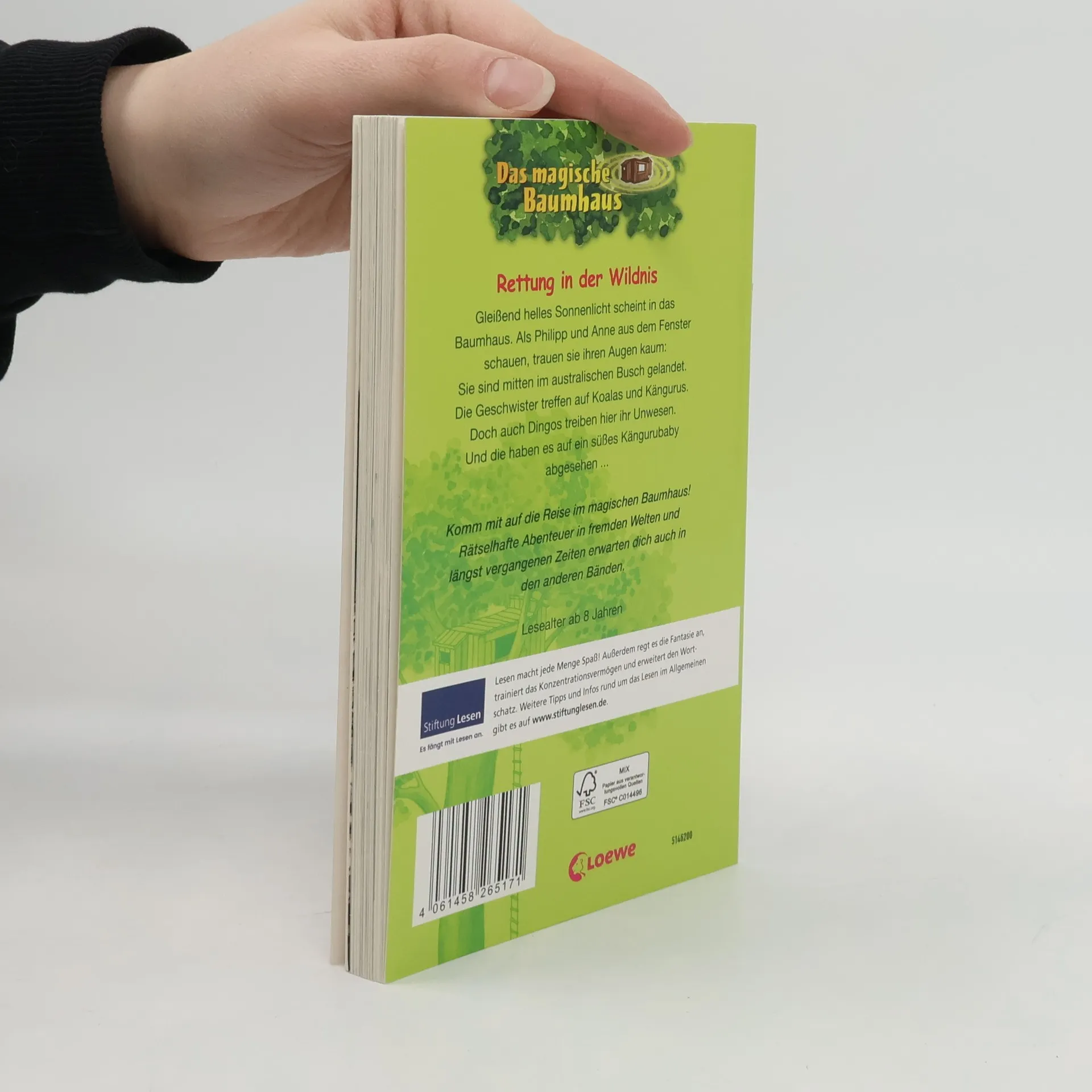 Das Buch ist bei deiner Buchhandlung vor Ort und bei vielen Online-Buchshops erhältlich! + Bücher, die Kinder gerne lesen wollen + Beliebte Themen: Abenteuer, Tiere und fremde Länder + Hochwertiges Hardcover + Mit vielen Illustrationen + Bereits über 10 Millionen verkaufte Bücher der Baumhaus-Reihe + Ausgewogenes Text-Bild-Verhältnis + Große Schrift + Kurze Kapitel + Gleißend helles Sonnenlicht scheint in das Baumhaus. Als Philipp und Anne aus dem Fenster schauen, trauen sie ihren Augen kaum: Sie sind mitten im australischen Busch gelandet. Die Geschwister treffen auf Koalas und Kängurus. Doch auch Dingos treiben hier ihr Unwesen. Und die haben es auf ein süßes Kängurubaby abgesehen ... Komm mit auf die Reise im magischen Baumhaus! Rätselhafte Abenteuer in fremden Welten und längst vergangenen Zeiten erwarten dich auch in den nächsten Bänden. Die beliebte Kinderbuch-Reihe von Bestsellerautorin Mary Pope Osborne! Die Geschwister Anne und Philipp reisen mit dem magischen Baumhaus durch die Zeit. Sie erleben spannende Abenteuer, entdecken ferne Länder und lernen viele berühmte Persönlichkeiten kennen. Mehr Infos zur Reihe und tolle Extras unter: www. MagischesBaumhaus. de