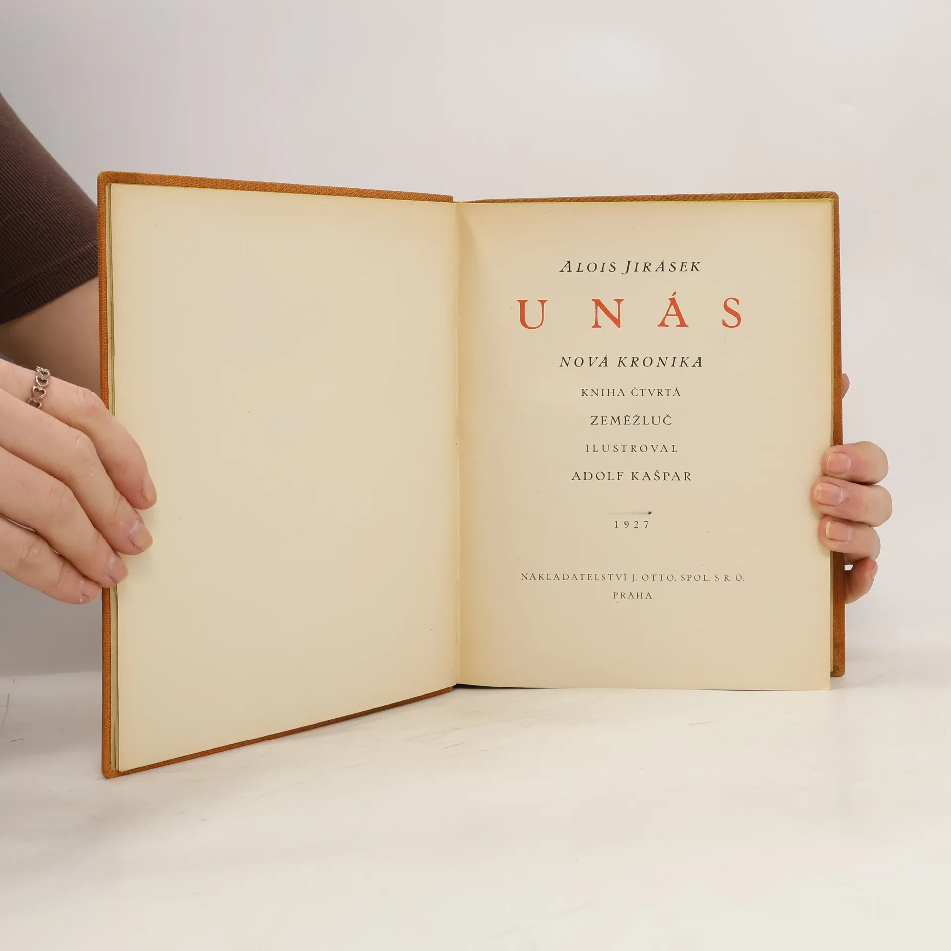 Alois Jirásek: U NÁS. Románová čtyřdílná kronika. Kniha čtvrtá - ZEMĚŽLUČ. Psáno roku 1901 - 1902. Druhé vydání v roce 1927. Nakladatelství J. Otto, spol. s r.o. v Praze, edice: Nová kronika. Tiskem České grafické unie, a.s. v Praze. Vazba celoplátěná nakladatelská s barevným popisem na hřbetu, stužková záložka.