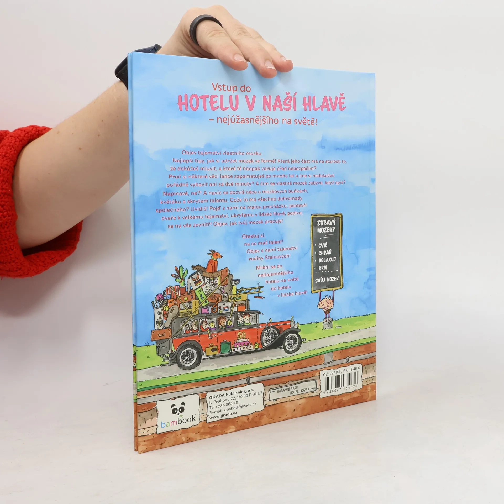 Odhalte tajemství svého mozku! Také jste zvědaví, jak funguje lidský mozek a co všechno dokáže? Představte si ho jako hotel v nejvyšším patře se spoustou pokojů a tajuplných zákoutí. Co to má s hotelem společného?! Uvidíte! Vydejte se s námi na malou procházku po cestičkách ukrytých v naší hlavě. Která nás dovede k tomu, že se naučíme mluvit a která nás varuje před nebezpečím? Proč si některé události snadno zapamatujeme po mnoho let a jiné už si nedokážeme vybavit ani ne za dvě minuty po jejich prožitku? A čím se vlastně mozek zabývá, když spíme? Vše se dozvíte, i to, jak si udržet mozek ve skvělé formě a o svém skrytém talentu.
