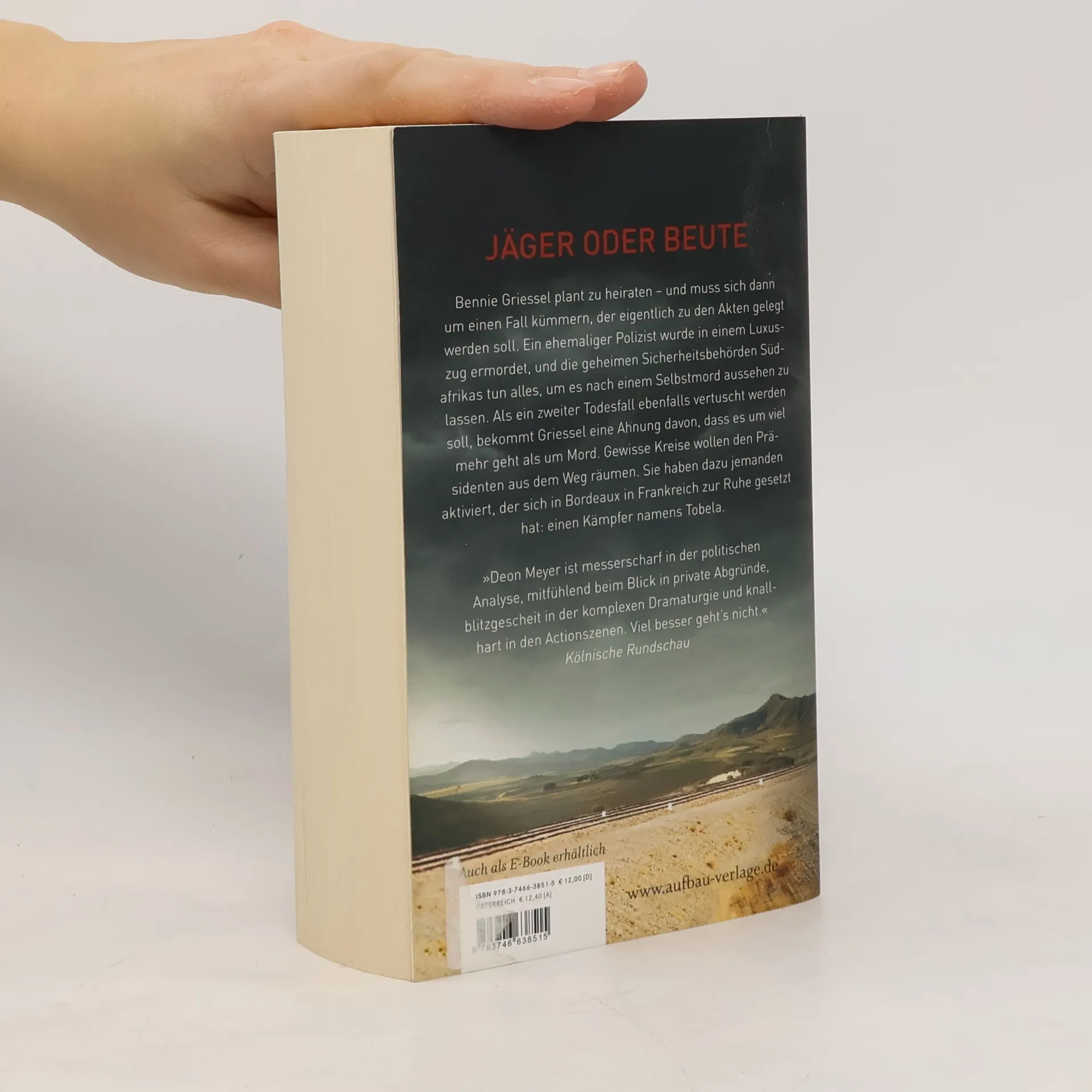 Jäger oder Beute. Bennie Griessel plant zu heiraten – und muss sich dann um einen Fall kümmern, der eigentlich zu den Akten gelegt soll. Ein ehemaliger Polizist wurde in einem Luxuszug ermordet, und die geheimen Sicherheitsbehörden Südafrikas tun alles, um es nach einem Selbstmord aussehen zu lassen. Als ein zweiter Todesfall ebenfalls vertuscht werden soll, bekommt Griessel eine Ahnung davon, dass es um viel mehr geht als um Mord. Gewisse Kreise wollen den Präsidenten aus dem Weg räumen. Sie haben dazu jemanden aktiviert, der sich in Bordeaux in Frankreich zur Ruhe gesetzt hat: einen Kämpfer namens Tobela. „Deon Meyer ist messerscharf in der politischen Analyse, mitfühlend beim Blick in private Abgründe, blitzgescheit in der komplexen Dramaturgie und knallhart in den Actionszenen. Viel besser geht's nicht.“ Kölnische Rundschau