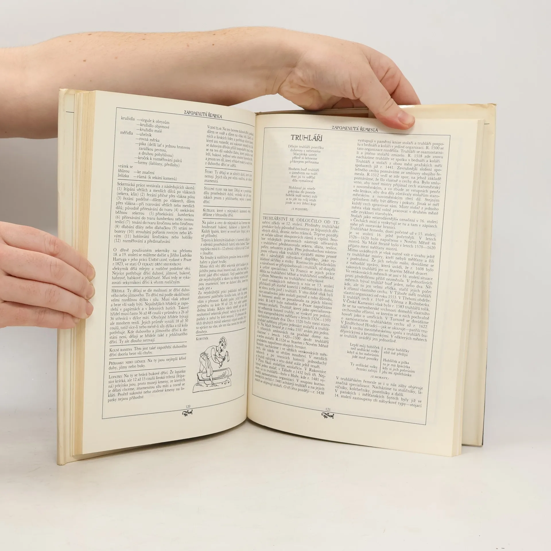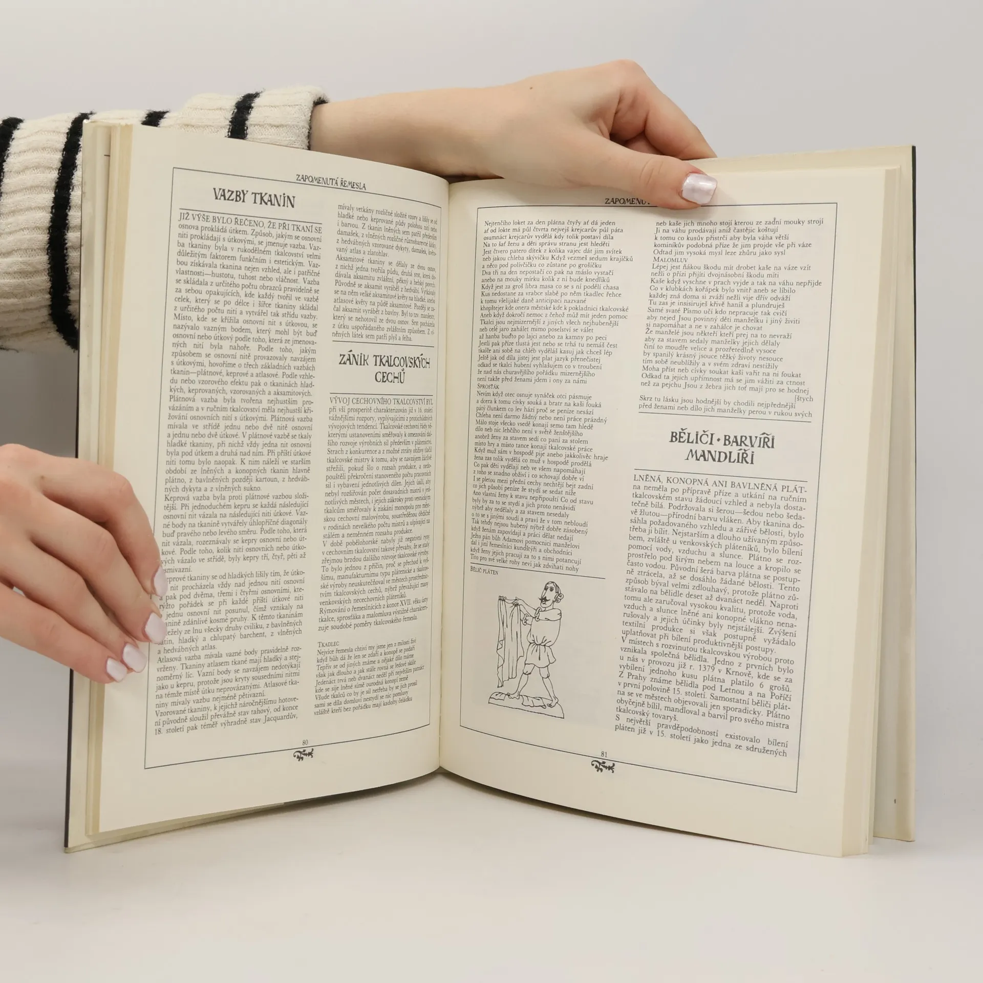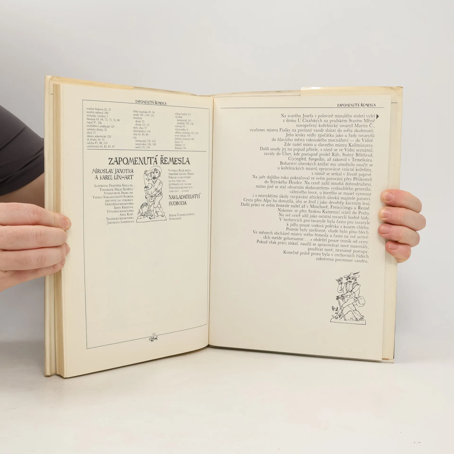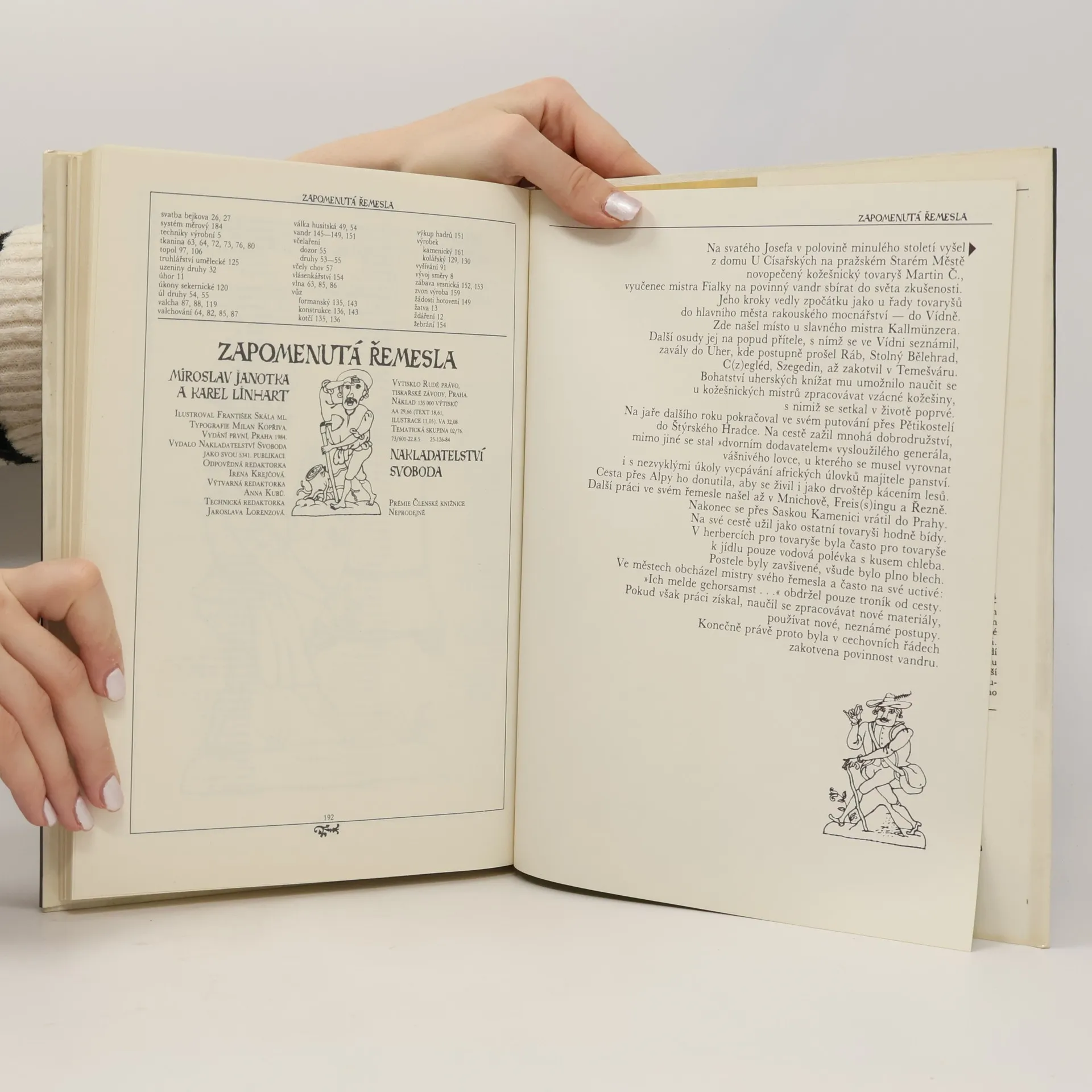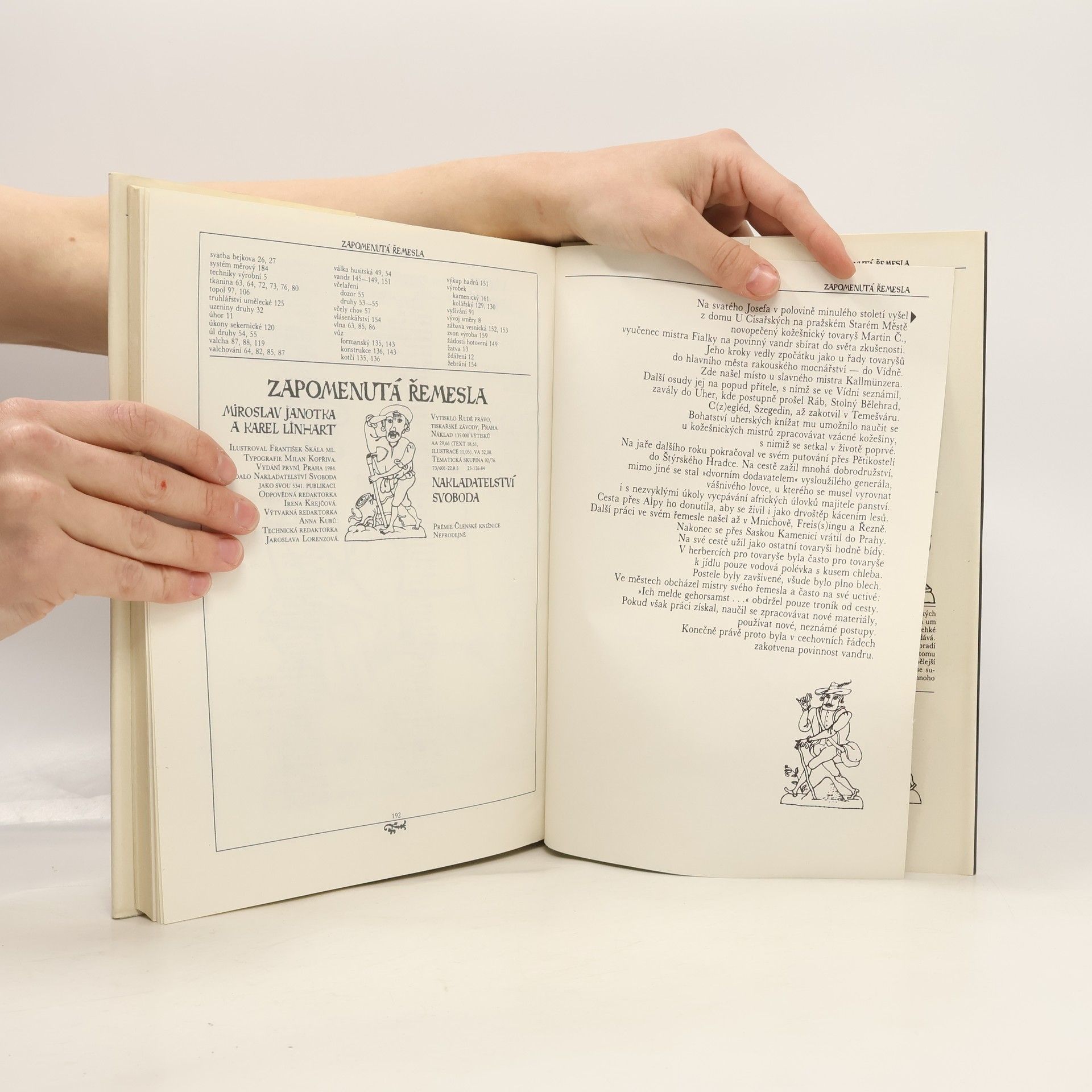 Nahlédnutí do zmizelého světa platnéřů, pasířů, krumpléřů, valchářů, bradýřů, lazebníků, truplařů, kameníků, štítařů, pernikářů, horologistů, konvářů, mistrů, tovaryšů a jiných "oudů" poctivých, učinlivých a ctnostným řemesel cechovních. Kniha hovoří o různých oborech lidské rukodělné činnosti, o materiálech, o funkční a výtvarné hodnotě vyráběných předmětů, o harmonii mezi jejich účelem, tvarem, barevností a zdobností, prostě o přírodě, lidech a věcech, o tvořivé práci, která prolínala a prolíná celým životem člověka. Kapitoly: Lidé a věci. Nejen chlebem živ je člověk: Lidé pracující na púde, Pastýři, slouhové, ovčáci, Řezníci, Uzenáři, Mlynáři, Pekaři, Pernikáři, Dílo medu, brtníci, včelaři. Starosti, jak a co na sebe: Příprava příze a její zpracování, Tkalci díla rozličného, Vývoj tklacovské techniky, Tkalcovská pohádka, Vazby tkanin, Zánik tkalcovských cechú, Běliči, barvíři, mandlíři, Tkalci vlny, Soukeníci, Mykači, Krampléři, Valcháři, Česači vlny, Postřihovači, Krejčí, Krumpléři a vyšívačky, Kloboučníci a šmukýři, Ševci. Dřevěný svět: Tesaři, Sekerníci, Truhláři, Koláři. Lidé světem jedoucí a jdoucí: Formani, Vandrovní tovariši, Světem jdoucí. Hrst řemesel nakonec: Malíři a iluminátoři, Cihláři, Hodináři, Zvonaři, Konváři, Zedníci a kameníci, Lékaři, Lazebníci a holiči. Malý slovník řemesel a lidských činností, Dvakrát měř a jednou řež, Věcný rejstřík. Prémie Členské knižnice (neprodejná)