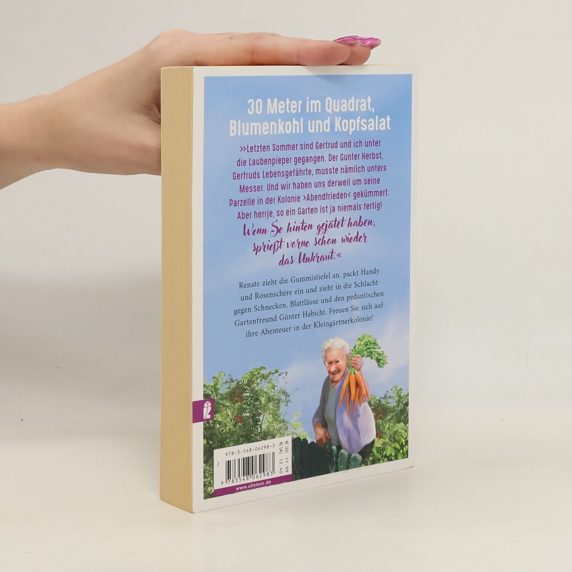 »Letzten Sommer sind Gertrud und ich unter die Laubenpieper gegangen. Der Gunter Herbst, Gertruds Lebensgefährte, musste nämlich unters Messer. Und da ihm seine Kohlrabi und Tomaten so sehr am Herzen liegen, haben wir uns derweil um seine Parzelle in der Kolonie ‚Abendfrieden‘ gekümmert. Aber herrje, so ein Garten ist ja niemals fertig! Wenn Se hinten gejätet haben, sprießt vorne schon wieder das Unkraut. Trotzdem haben wir bei der Wahl zum schönsten Garten der Kolonie den zweiten Platz gemacht! Für den ersten Platz hat es nicht gereicht, wissen Se, die Schlehdorn von Parzelle 6 hatte uns eine hübsche Topfpflanze ins Gewächshaus gestellt, und dann hätte der Günter Habicht beinahe wegen Hanfanbau die Polizei gerufen, denken Se sich das nur! Aber ein zweiter Platz ist ja auch schön.« Renate zieht die Gummistiefel an und packt Handy und Rosenschere ein. Freuen Sie sich auf ihre Abenteuer in der Kleingärtnerkolonie!