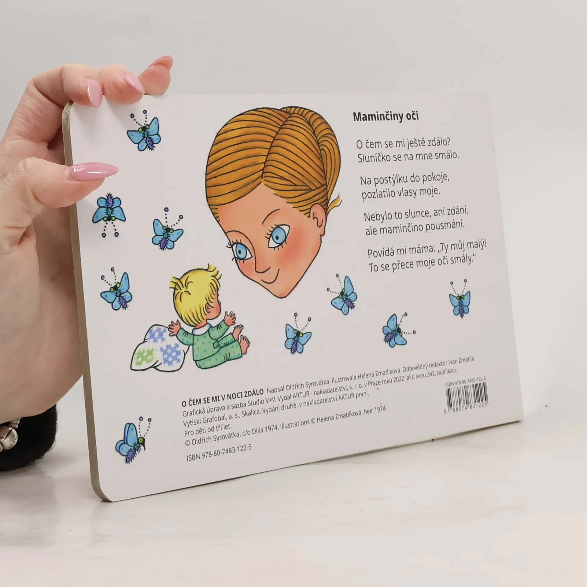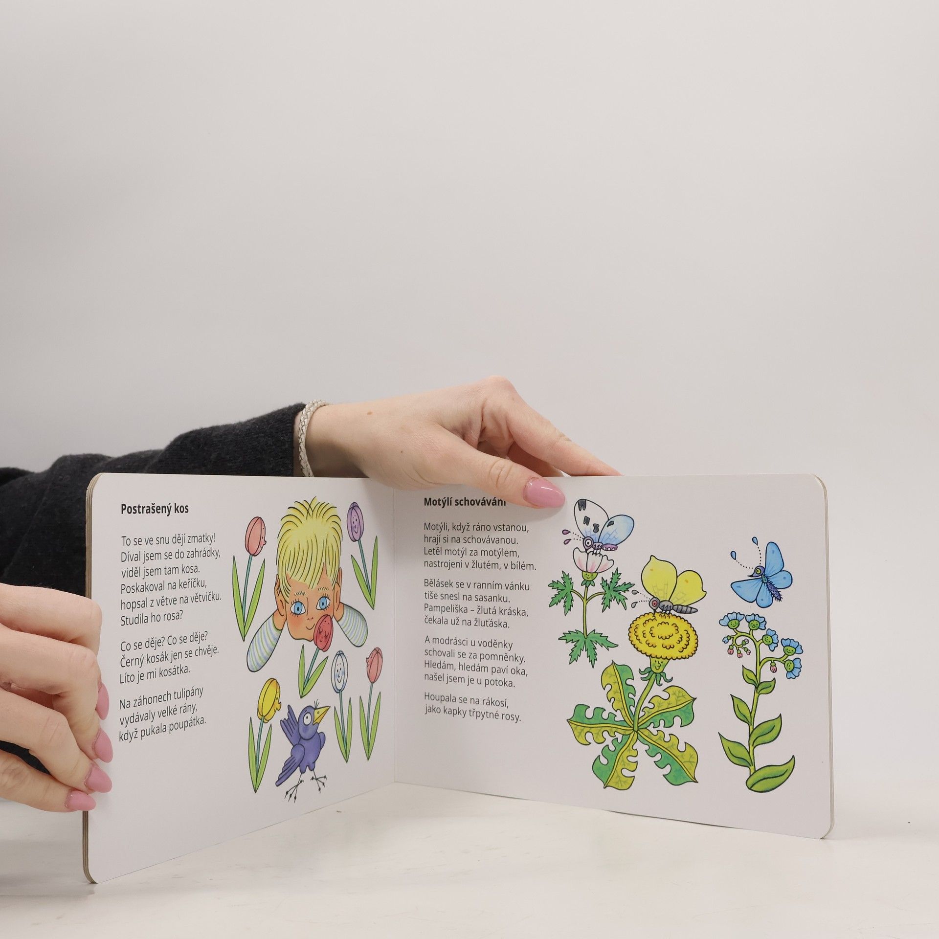 Kresby Heleny Zmatlíkové doprovázejí říkanky plné poutavé fantazie. Objevují se v nich barevní motýlci, kočička i lev, ale v dětských snech ožijí i kleště či jehla s nití. Pro děti od tří let.