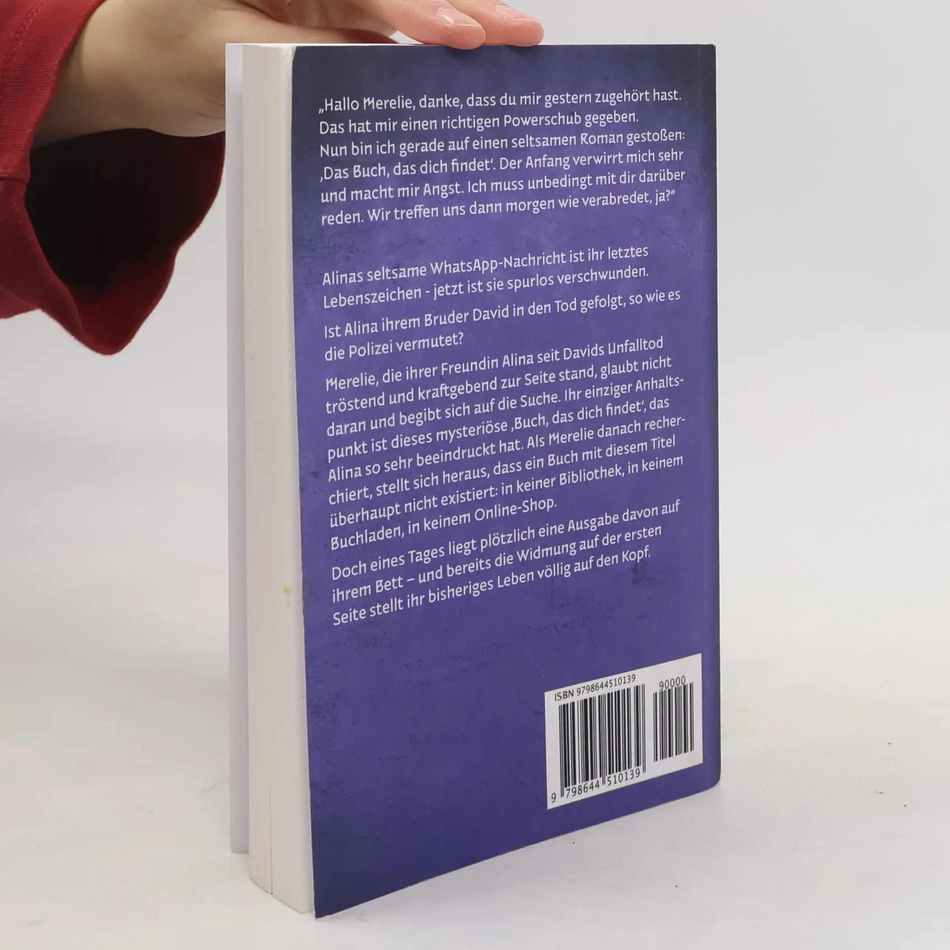 ,,Hallo Merelie, danke, dass du mir gestern zugehört hast. Das hat mir einen richtigen Powerschub gegeben. Nun bin ich gerade auf einen seltsamen Roman gestoßen: ,Das Buch, das dich findet'. Der Anfang verwirrt mich sehr und macht mir Angst. Ich muss unbedingt mit dir darüber reden. Wir treffen uns dann morgen wie verabredet, ja?" Alinas seltsame WhatsApp-Nachricht ist ihr letztes Lebenszeichen - jetzt ist sie spurlos verschwunden. Ist Alina ihrem Bruder David in den Tod gefolgt, so wie es die Polizei vermutet? Merelie, die ihrer Freundin Alina seit Davids Unfalltod tröstend und kraftgebend zur Seite stand, glaubt nicht daran und begibt sich auf die Suche. Ihr einziger Anhaltspunkt ist dieses mysteriöse 'Buch, das dich findet', das Alina so sehr beeindruckt hat. Als Merelie danach recherchiert, stellt sich heraus, dass ein Buch mit diesem Titel überhaupt nicht existiert: in keiner Bibliothek, in keinem Buchladen, in keinem Online-Shop. Doch eines Tages liegt plötzlich eine Ausgabe davon auf ihrem Bett - und bereits die Widmung auf der ersten Seite stellt ihr bisheriges Leben völlig auf den Kopf.